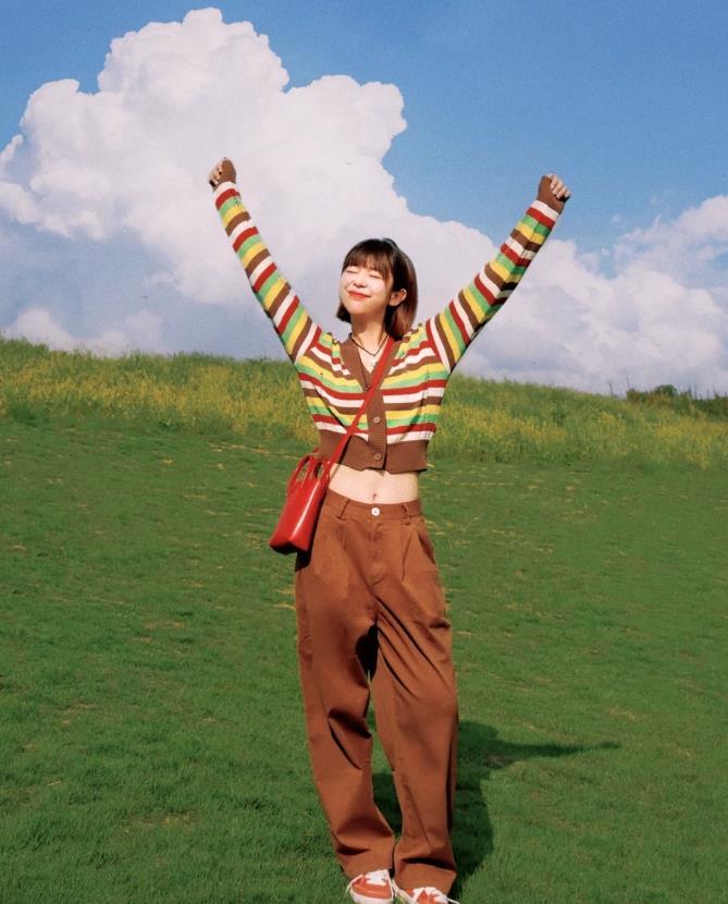 這樣一套充滿活力又吸睛的穿搭,真的很難讓人不喜歡呢,彩色條紋短款開衫,將腰線露出來,既顯得利落又能在視覺上拉長身材比例,下身搭配棕色闊腿褲,整個穿搭寬鬆舒適,再搭配一個紅色的挎包,與紅白相間的鞋子進行了呼應,色彩組合和諧又吸睛。