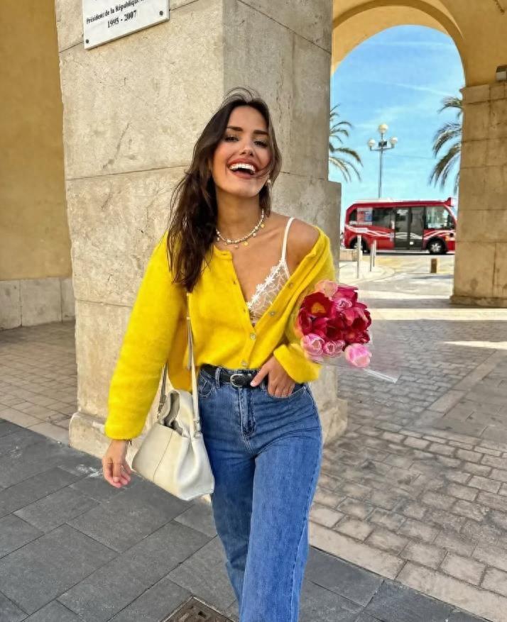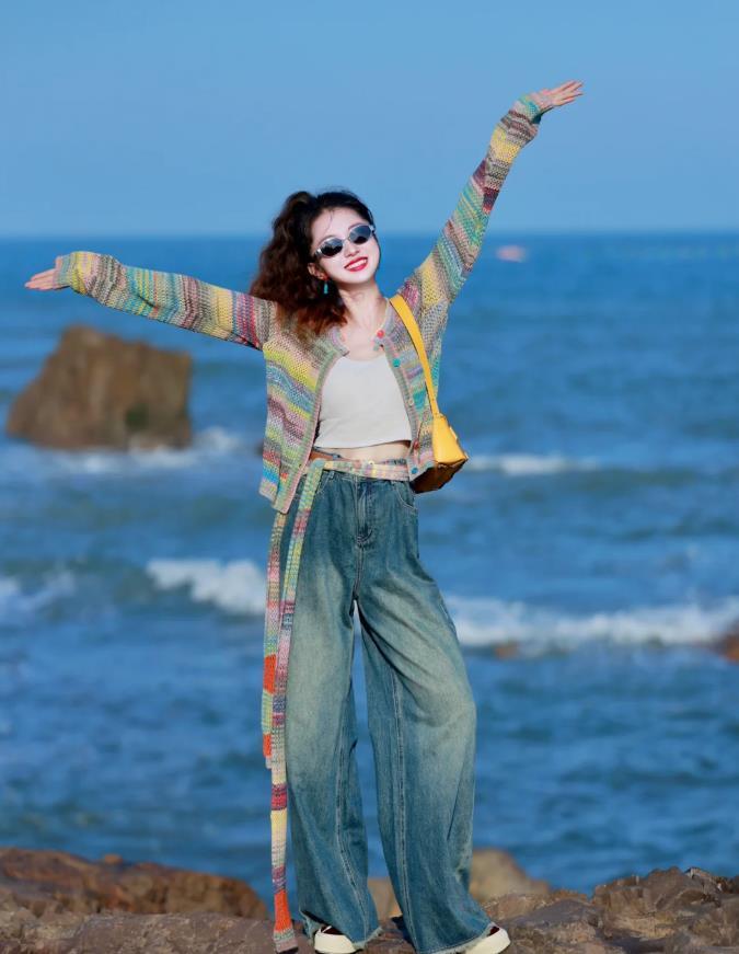 充滿度假風的一套穿搭,彩色針織開衫,利落的短款,可以直接單穿,也可以當做小外套,內搭白色短款上衣,微微露出的腰線,在視覺上輕鬆拉長下身的比例,選擇復古藍牛仔闊腿褲相配,又增添了幾分隨性自在,黃色挎包與墨鏡的增加,隨隨便便就營造出氛圍感。
