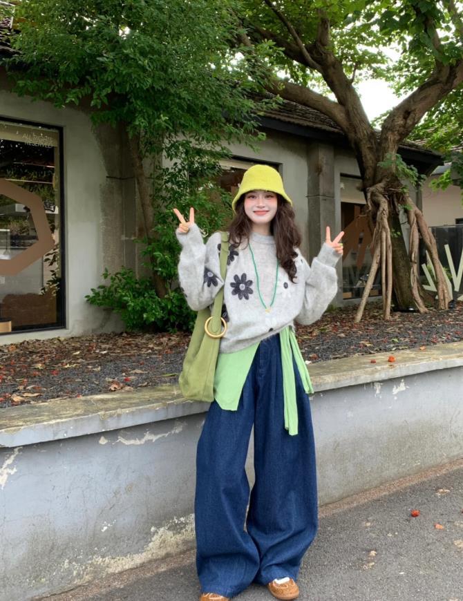 這樣一套穿搭,看起來也太顯清新與活潑了,淺灰色花朵毛衣,看着就很溫柔可愛,選擇深藍色牛仔闊腿褲來配,寬鬆自在,而腰間綠色的點綴,與包包,還有漁夫帽進行了還有,整個穿搭色彩明快又協調,很適合日常逛街的穿搭。
