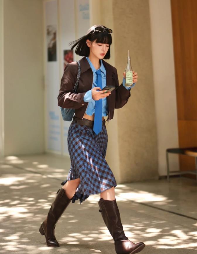帶些濃濃復古氣息又不失個性的穿搭,內搭藍色襯衫與同色領帶,真的對整個穿搭都進行了提亮,外面搭配的棕色短外套,最適合小個子女生了,輕鬆打造出利落率性感,而下身配的藍棕格紋開衩半裙,更是細節感十足,與棕色長靴相配,配色很是和諧,墨鏡的加持下,又多了幾分酷帥。