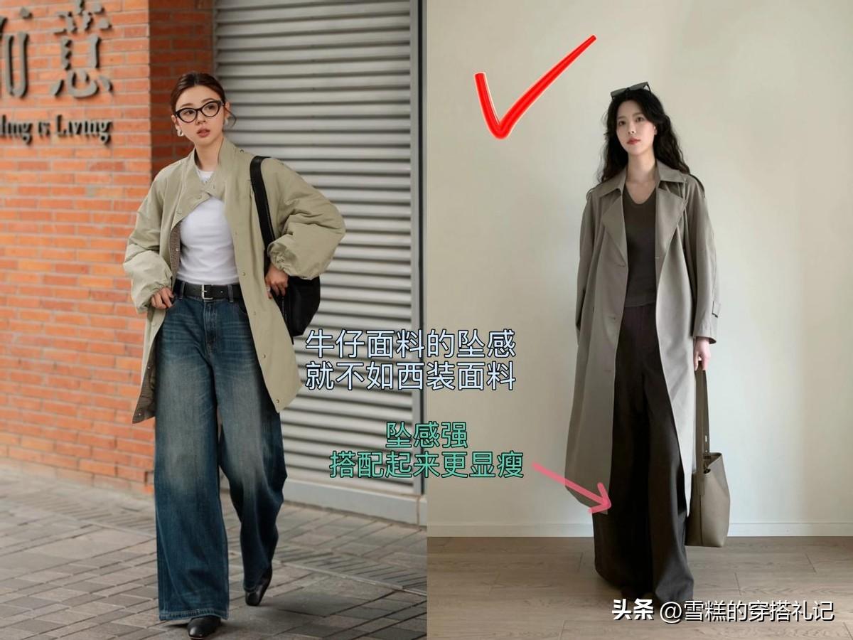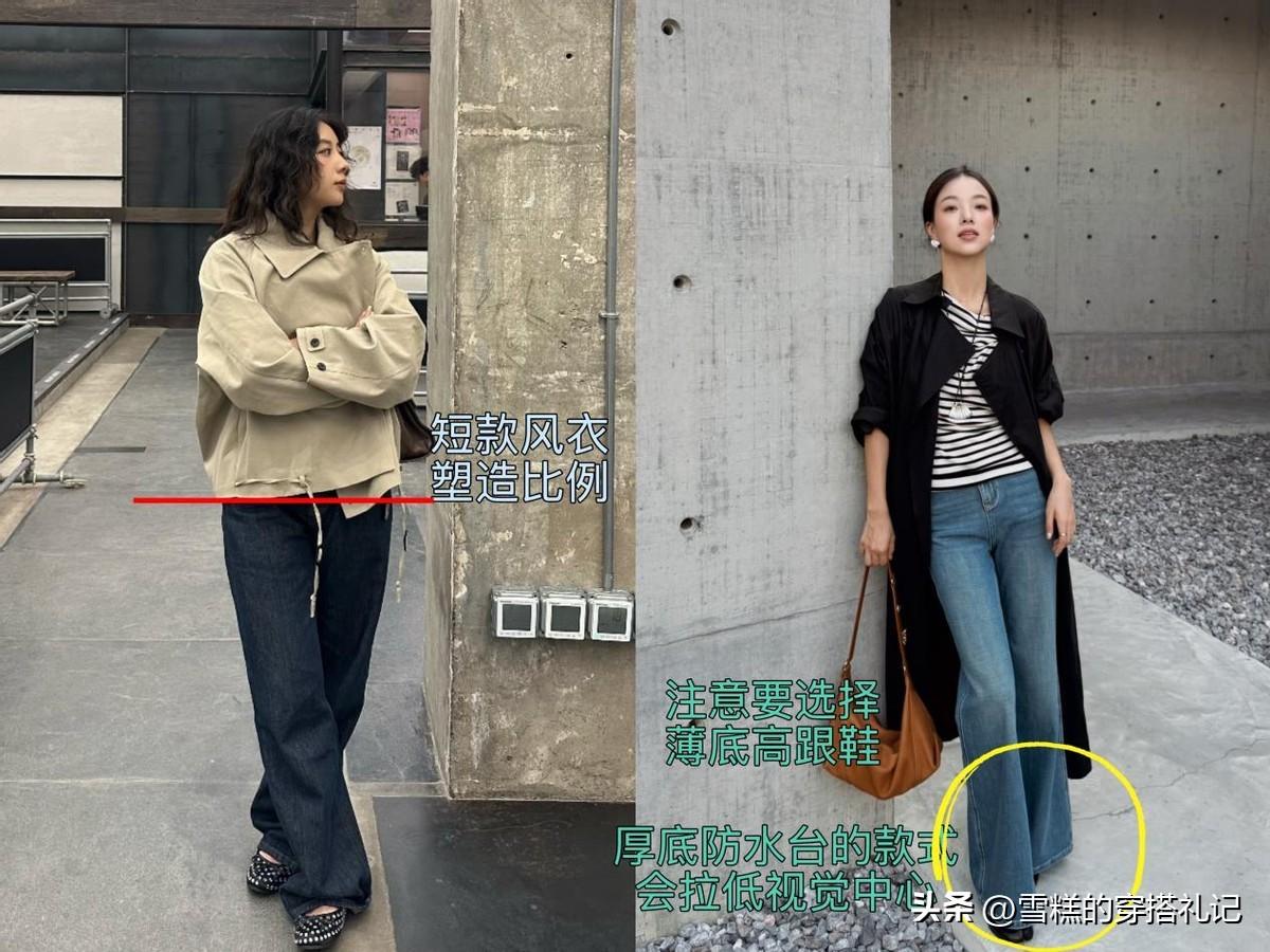1.高腰闊腿褲+拖地褲:選擇高腰闊腿褲,將上衣衣角塞進褲腰,突出腰線,同時選擇拖地款闊腿褲,露出腳踝,讓腿部線條從腰線延伸到腳背,視覺上拉長下半身比例。比如卡其色風衣搭配高腰拖地闊腿牛仔褲,褲子的長度要蓋住一半的鞋背爲最佳。