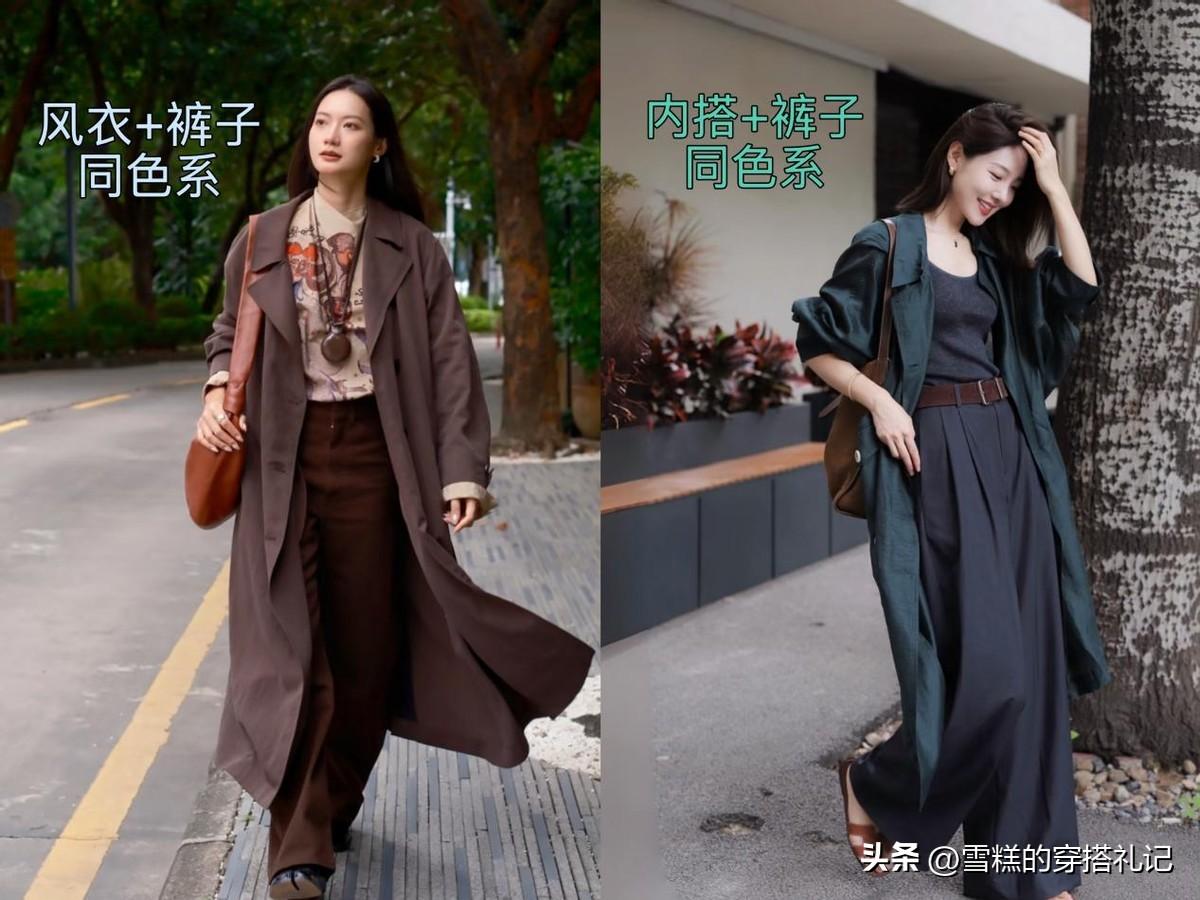 2.同色系搭配:風衣與闊腿褲選擇同色系或鄰近色,打造“順色”穿搭,能從視覺上拉長整體線條,顯得更高更瘦。比如棕色風衣搭配棕色闊腿褲,內搭印花針織,整體色調柔和協調,高級感滿滿;墨綠色風衣搭配深灰色闊腿褲,內搭低領針織衫,打造鬆弛慵懶的OL風穿搭。