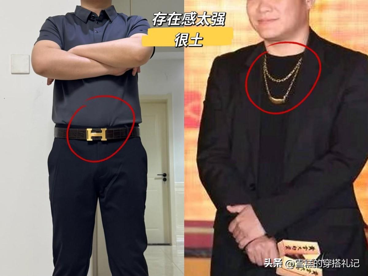 部分男性認爲“大logo=有面子”,於是選擇佈滿品牌標識的金屬項鍊、手鍊或皮帶扣。比如鏈條粗過手指、表面刻滿巨大字母的鈦鋼項鍊,或是扣頭比手掌還寬、鑲滿水鑽的皮帶,這類配飾看似“存在感強”,實則用力過猛。