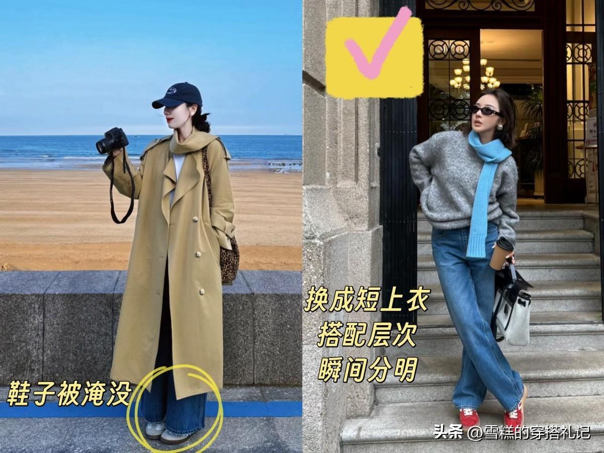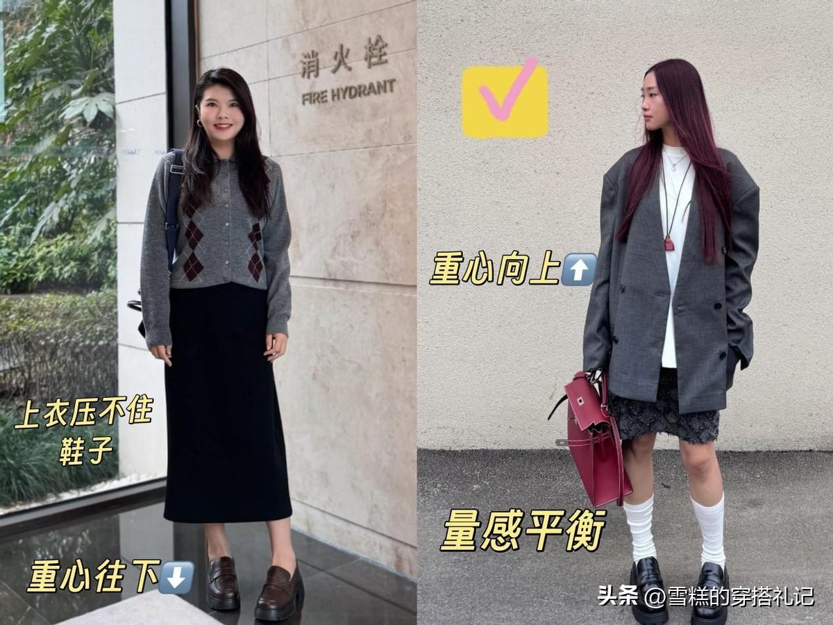 例子2. 厚底樂福鞋(較重重量感):搭配有體積感的上衣。厚底樂福鞋的厚底設計讓鞋子視覺上“重量感”較強,上衣需選擇有一定體積感的款式,如oversize西裝、長款毛呢大衣、等,通過上衣的體積感平衡鞋子的重量感,避免搭配過於緊身、輕薄的上衣,否則會讓下半身顯得笨重,上半身顯得單薄,整體比例失衡。