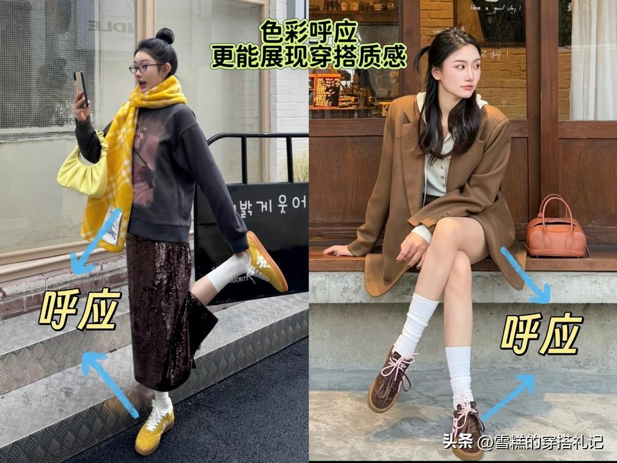 例子1.復古德訓鞋(輕重量感):搭配輕量感上衣。德訓鞋的鞋身輕盈,鞋底厚度適中,視覺上屬於“輕重量感”鞋子,上衣需選擇同樣輕量感的款式,如針織衫、襯衫,避免搭配厚重的羽絨服、毛呢大衣(冬季可搭配,但需選擇短款,避免上衣過長壓個子)。