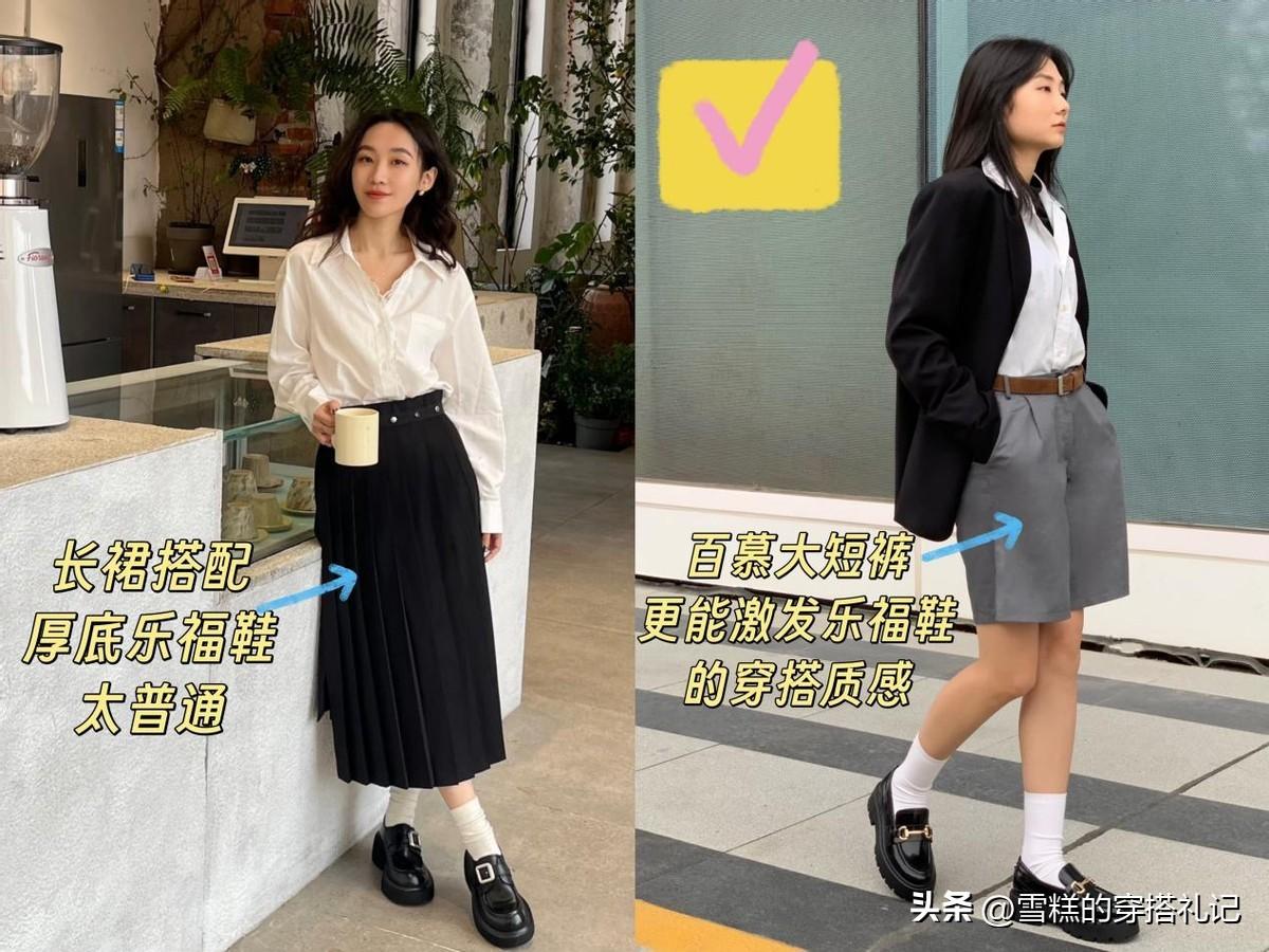 分類2.厚底樂福鞋:“露腳踝”是顯高關鍵。厚底樂福鞋的厚底設計本就是爲了顯高,而且樂福鞋是淺口鞋,如果搭配露腿的下裝,更顯修長和輕盈,因此推薦露腳踝。
