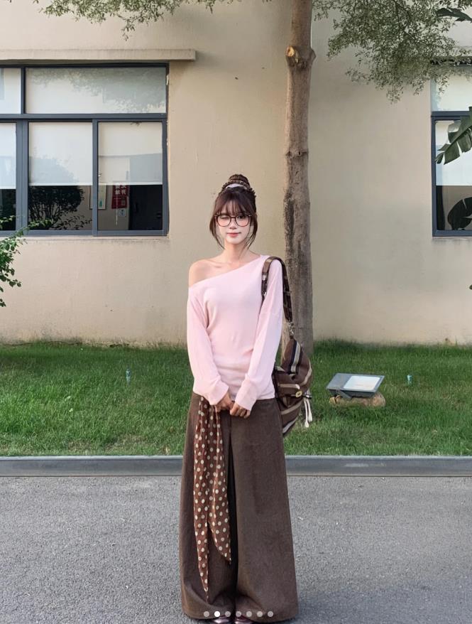 很是清新雅緻的打扮,深棕色闊腿褲,實在是太適合秋冬季節了,與淺粉色露肩上衣進行搭配,露出精緻的肩部線條,柔美感十足,上衣下裝都是基礎款,所以必須要懂得利用一些配飾來點綴,搭配與褲子顏色一致的波點絲巾,增添細節感又顯得很復古,爲整個穿搭注入了文藝氣息。