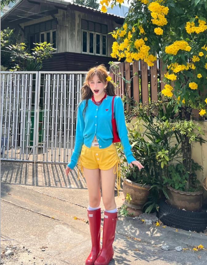秋冬的穿搭,就應該穿得明豔一些纔好,湖藍色開衫,這個色調實在是太清新亮眼了,配上黃色短褲,整個穿搭都洋溢着青春與活力,選擇紅色中筒靴來配,加上紅色挎包相呼應,整個風格撞色大膽,顯得熱烈又不失俏皮。