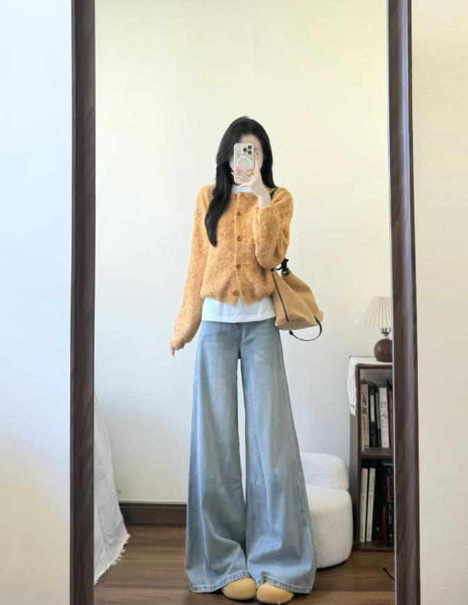 這個秋天,穿針織衫,還是配闊腿褲更好看呢,奶黃色的針織開衫,小短款的長度,可是太適合個矮女生了,柔軟又親膚,整個色調溫暖又清新,內搭白色上衣,很乾淨時尚,淺藍色牛仔闊腿褲,穿得舒適自在又隨性,腳上是一雙黃色鞋子,恰到好處與針織衫進行了呼應。