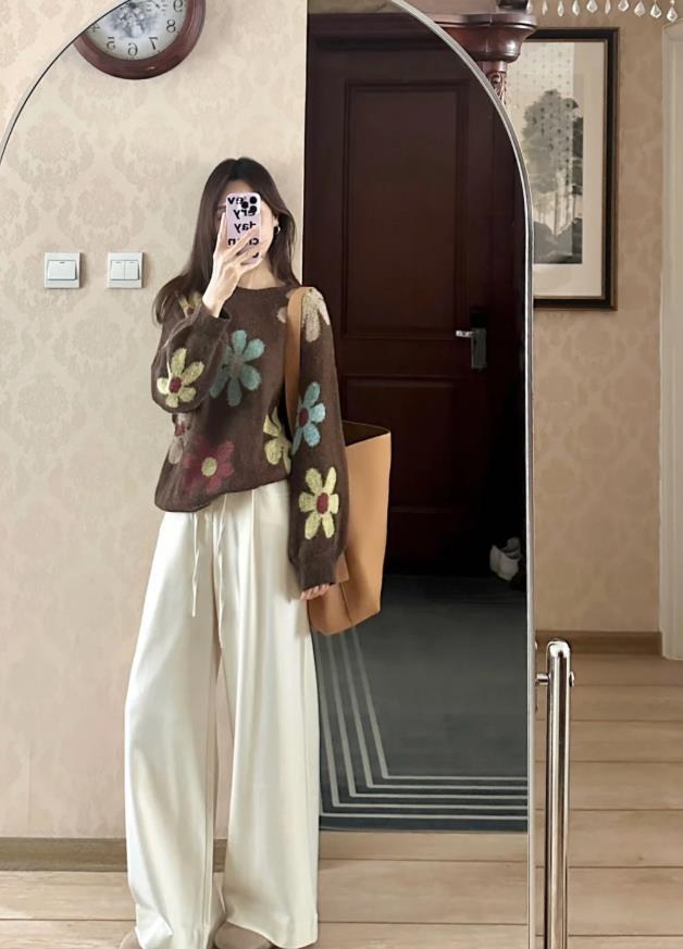 今年秋天,穿得慵懶隨性一些會更時尚,這麼一套穿搭既顯復古又溫柔,棕色基礎款毛衣,上面的花朵圖案點綴,提升了時尚氣息,又多了幾分藝術感,選擇米白色闊腿褲來配,垂墜感十足的褲子,顯腿長還藏肉,搭配棕色大包包,色調和諧又顯休閒。