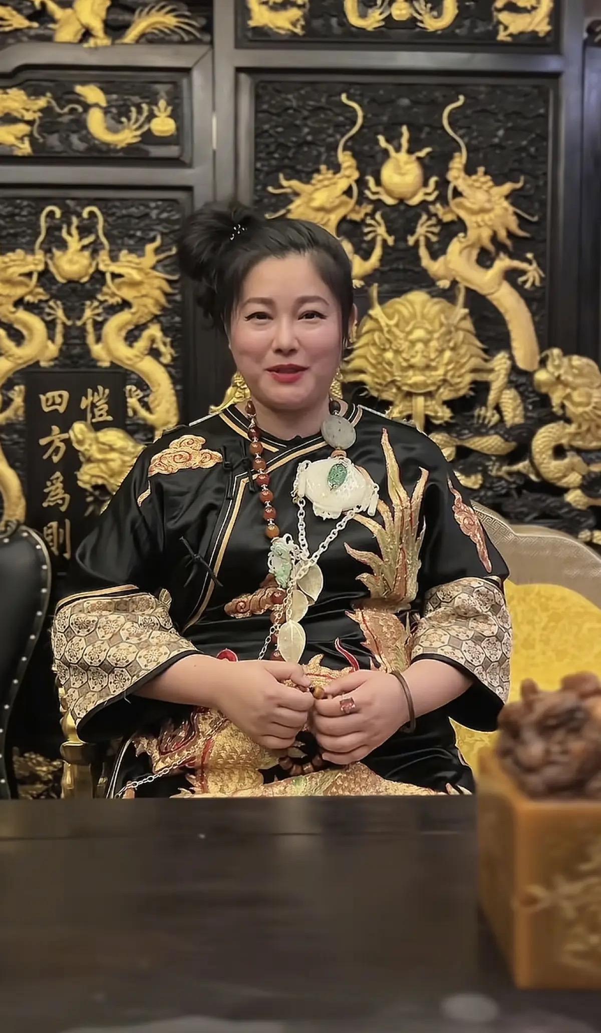 8月份的時候,他在好友劉彭的視頻中盛裝出鏡。穿龍袍、戴翡翠,衣副華麗端莊的模樣,身材富態,更顯貴氣逼人。