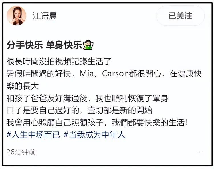 這樣的婚姻,不要也罷。於是9年後,江語晨大方的官宣離婚。她說:分手快樂!單身快樂!語氣輕柔的還像是當年說着“原來我是奶茶”的那個女孩子,充滿着甜膩膩的味道。
