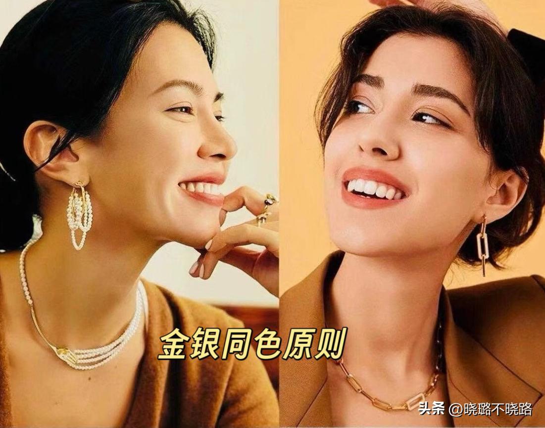 像一些質感比較高級的首飾,就很適合採用相同的材質,比如項鍊、耳環、戒指、腰帶金屬扣、帽子裝飾,儘量可以做到同色系,視覺上纔會顯得更和諧。