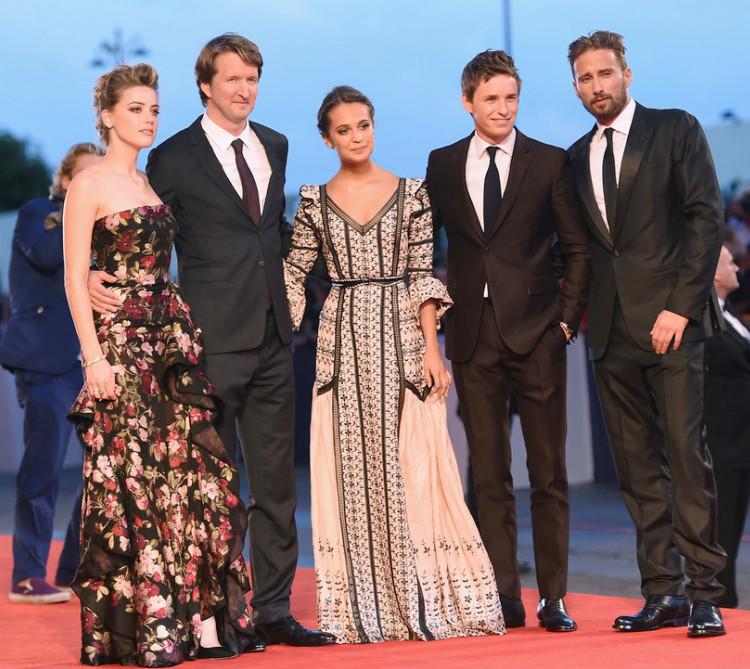 威尼斯電影節紅毯上,她一襲抹胸印花禮服亮相,與埃迪並肩出席《丹麥女孩》首映。柔美的印花在絲質面料上流轉,抹胸設計勾勒出優雅肩頸線,沒有誇張配飾,卻在光影中自帶光芒,與埃迪的黑色西裝形成溫柔呼應。