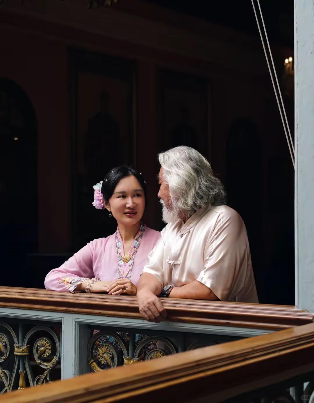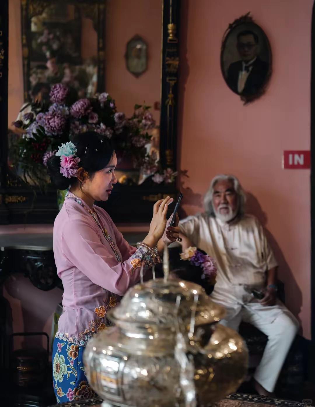 大概是爲了出片,張紀中也會陪着老婆拍照。他們有專業的攝影師跟拍,也有專業的道服化,杜星霖穿着娘惹服飾、做了簪花的造型,端莊貴氣。