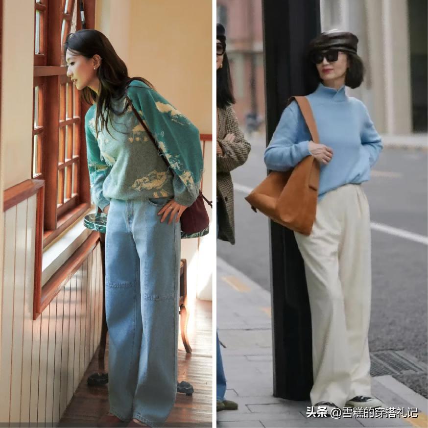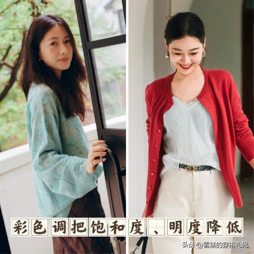 即便我們的年齡階段已經到了四五十歲的時候,針織衫這樣的單品搭配想要穿得更加減齡和具有視覺上的豐富感,推薦大家可以加入一些彩色的元素,但是針織衫這款單品一定是非常穩定的彩色系或者是基礎色搭配。
