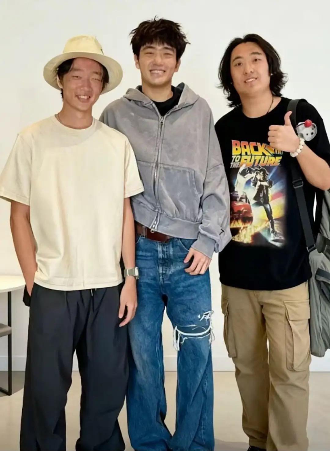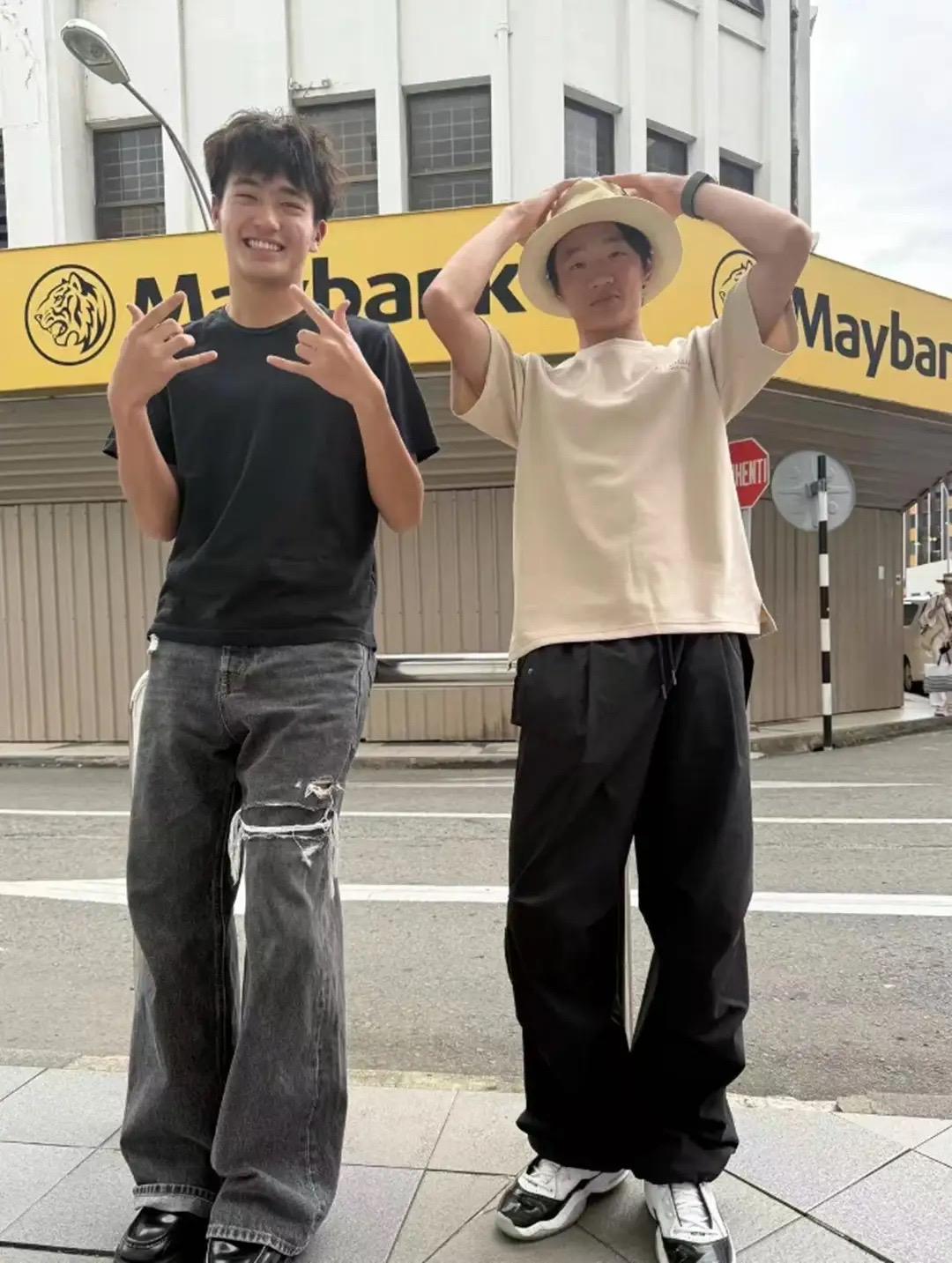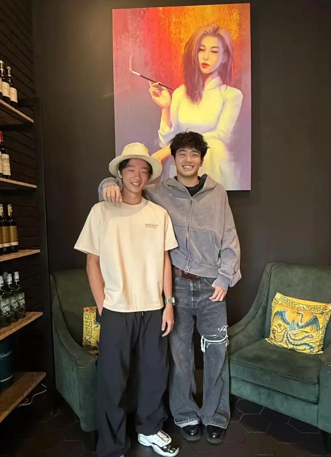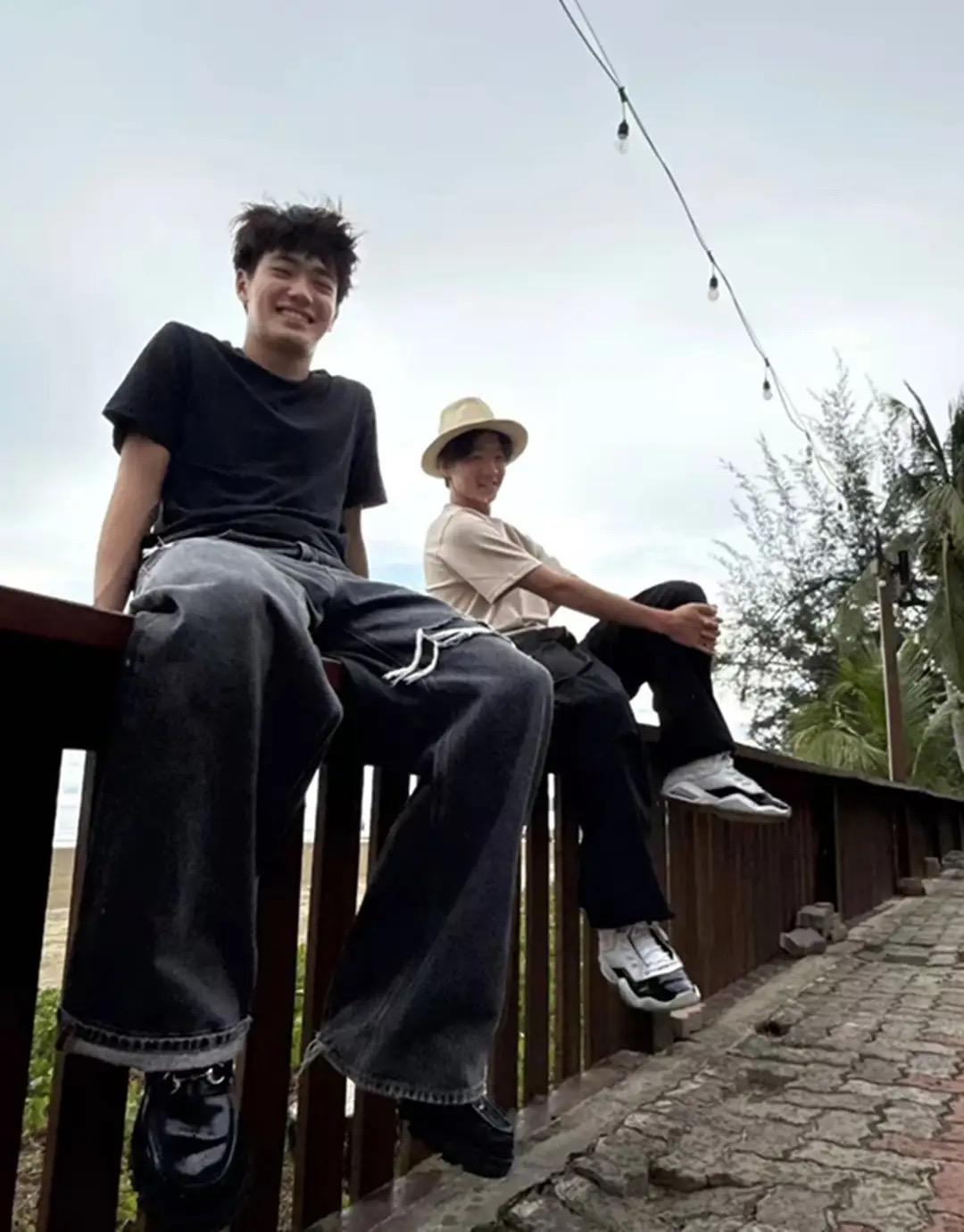 在Joe的社交平臺,曬出二人合影。17歲的Joe長得高大帥氣,穿一件黑色T恤、個性的牛仔闊腿褲,頭髮燙了好看的紋理卷,顯得五官更加立體俊朗。
