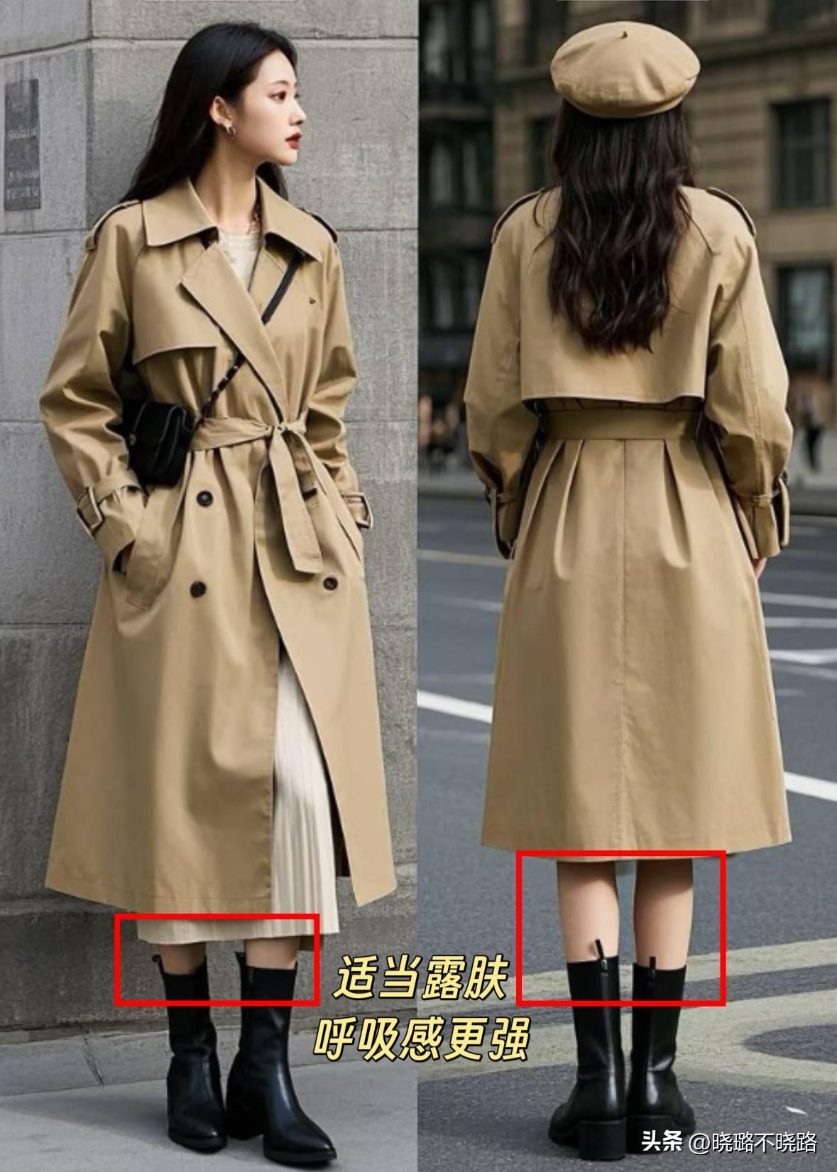 細節可以決定一組造型的成敗,通常情況下,風衣長度一旦沒選對,就會出現壓個子、顯胖、臃腫的情況,所以我們要學會根據身高選衣長,按照實際情況,衣長可以上下浮動5cm左右。