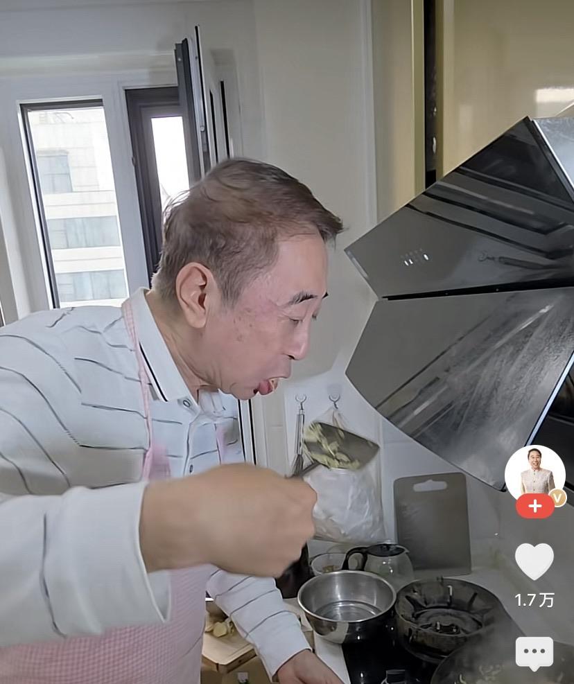 馮鞏摘掉帽子以後,看着他的頭髮特別稀疏,臉上的老年斑很明顯。甚至做飯的時候、後背也有點駝了,真的是歲月不饒人啊。