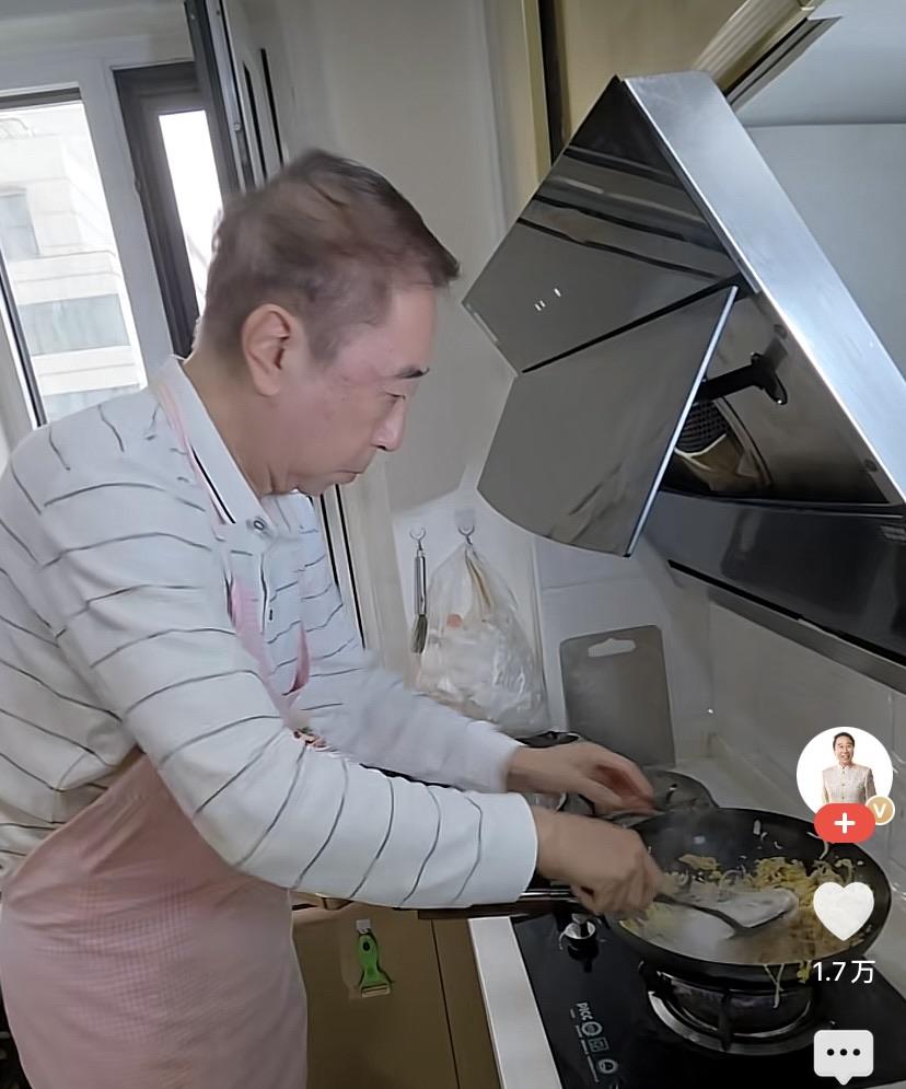 穿上粉色的圍裙,就開始下廚做飯了。哥姐年紀大了、都七八十歲了,做飯這件事情有點力不從心,馮鞏就自己包攬了。