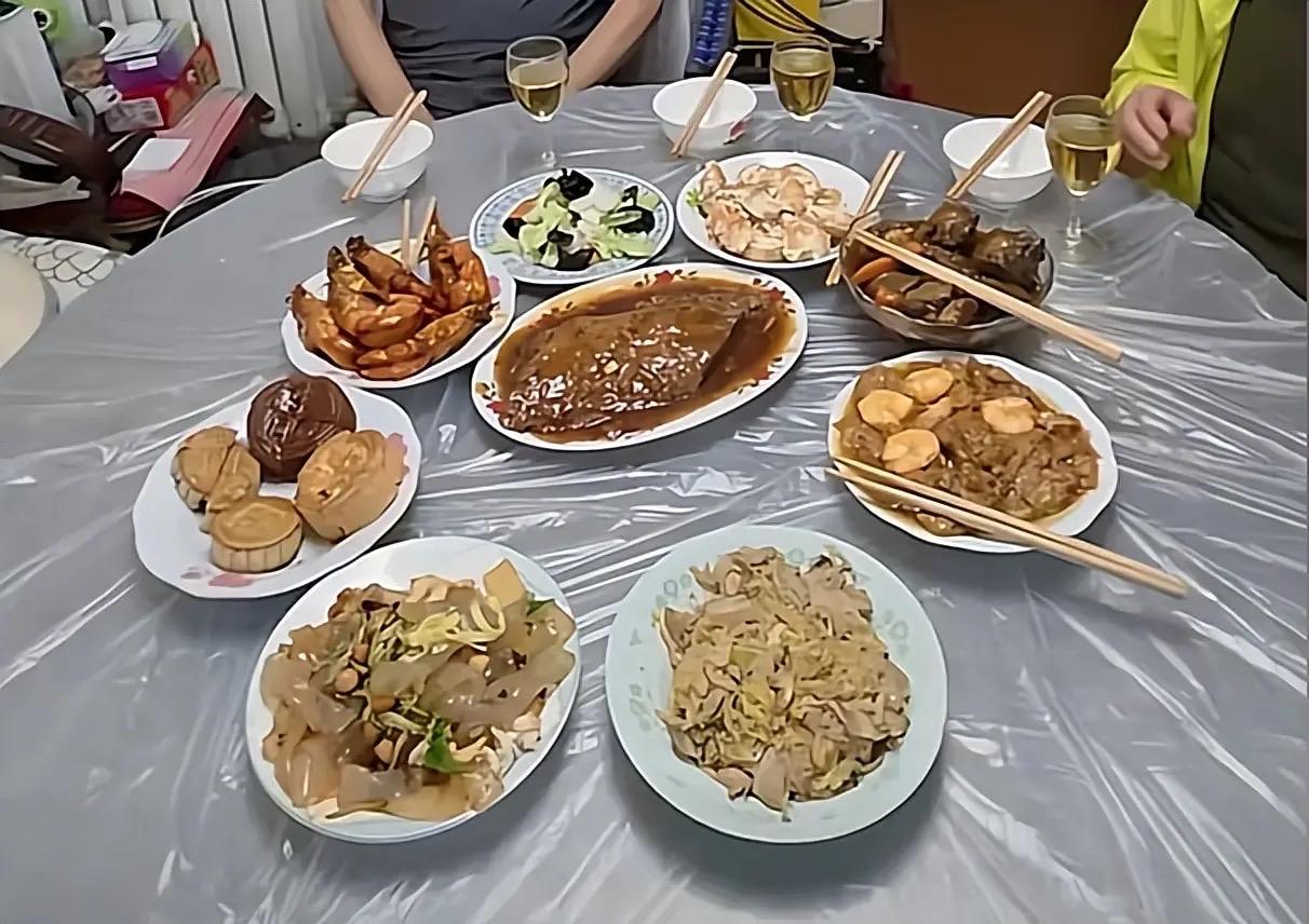 一桌子8個菜,都是家常菜,看起來很有食慾。風格的大哥頭髮都白了,行動也有些不方便了,姐姐倒是還很精神。