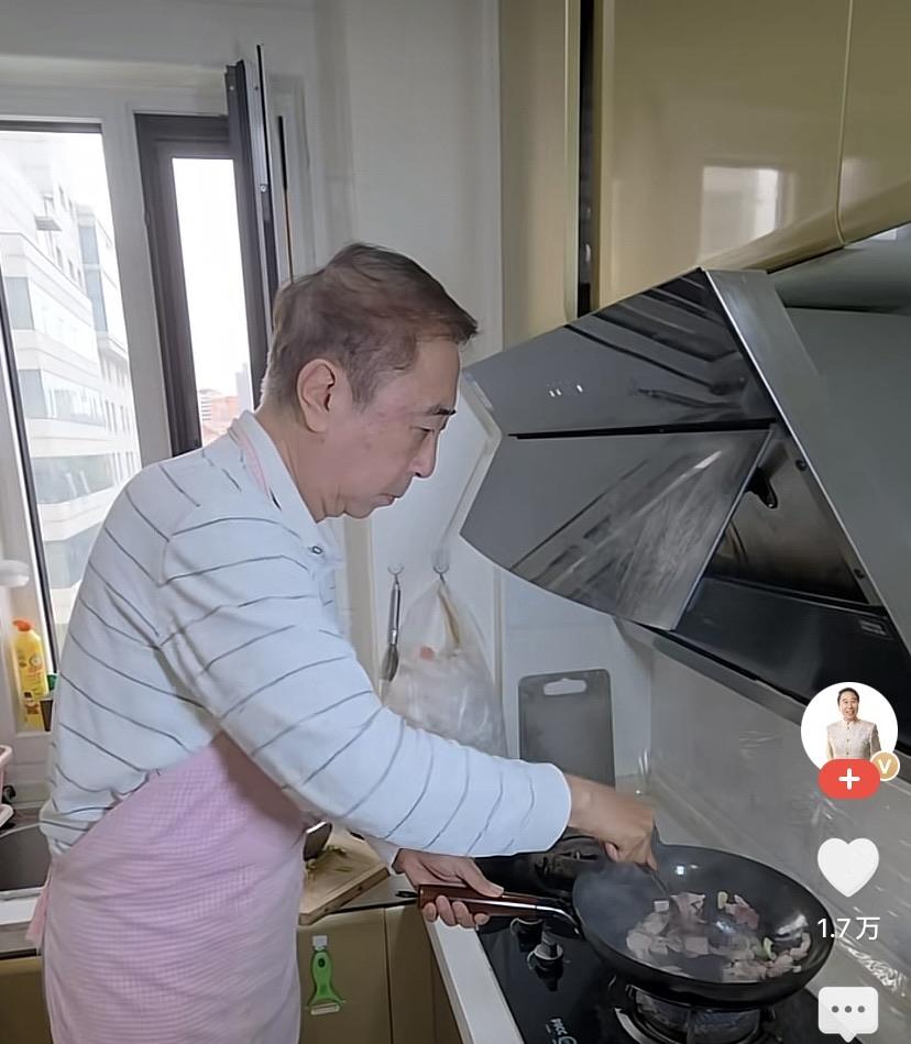 穿上粉色的圍裙,就開始下廚做飯了。哥姐年紀大了、都七八十歲了,做飯這件事情有點力不從心,馮鞏就自己包攬了。