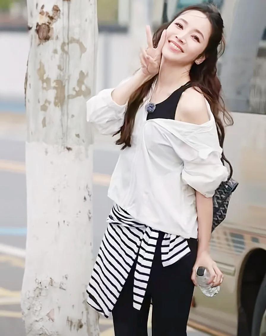 侯佩岑的日常穿搭中,小女人風單品佔比極高,泡泡袖、一字肩、條紋衫是她的 “三大法寶”。錄製《婆婆和媽媽》時,她穿一件白色泡泡袖襯衫,搭配淺藍色高腰牛仔褲,腳踩一雙米色平底鞋。