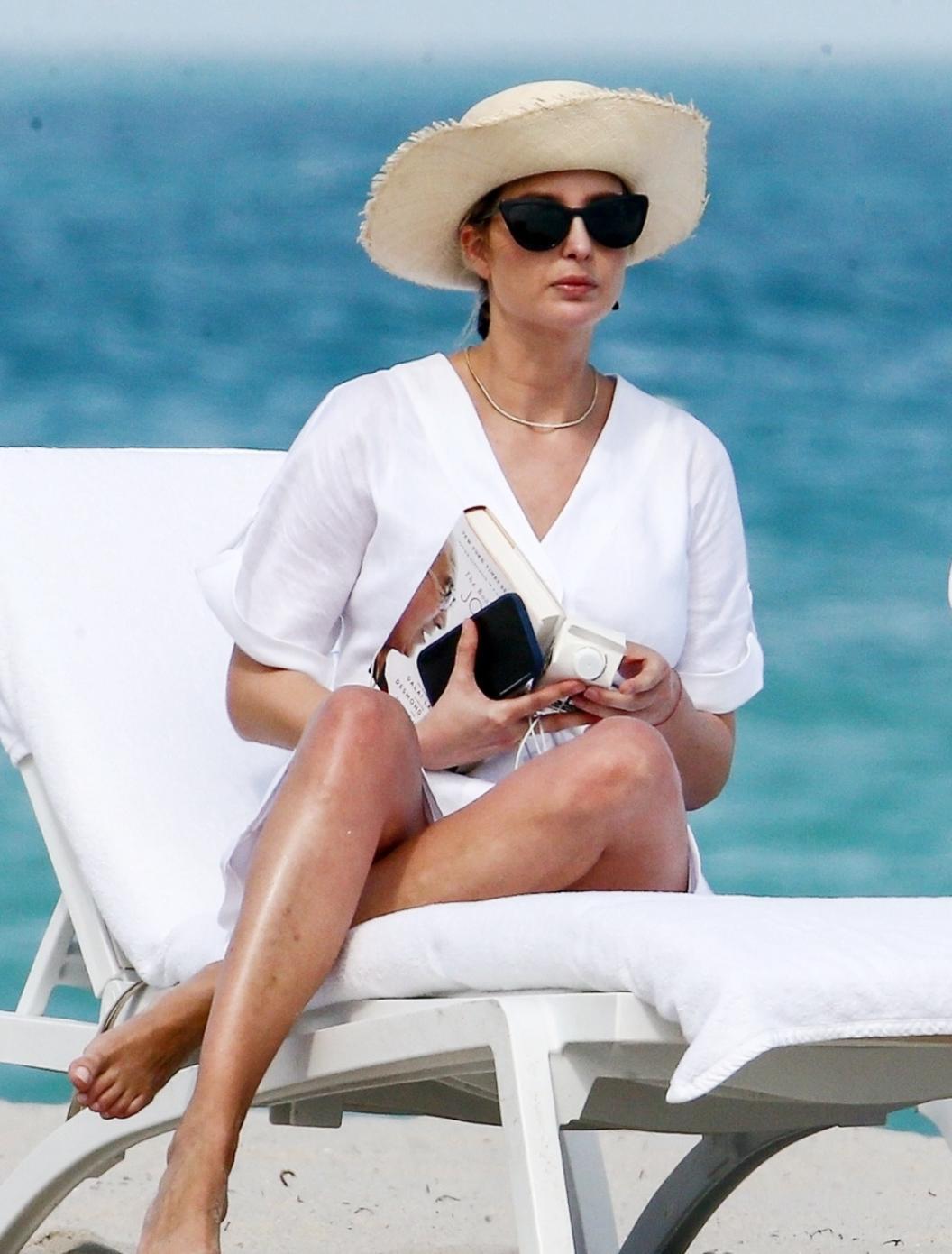 寬鬆長裙是伊萬卡度假時的另一心頭好,而白色、藍色、玫紅色等清麗色彩,更是她的首選。在邁阿密的海灘上,她曾穿一襲白色寬鬆蕾絲鏤空裙,海風拂過裙襬,鏤空花紋透出海浪般的韻律,搭配單肩竹子包,仙氣十足。