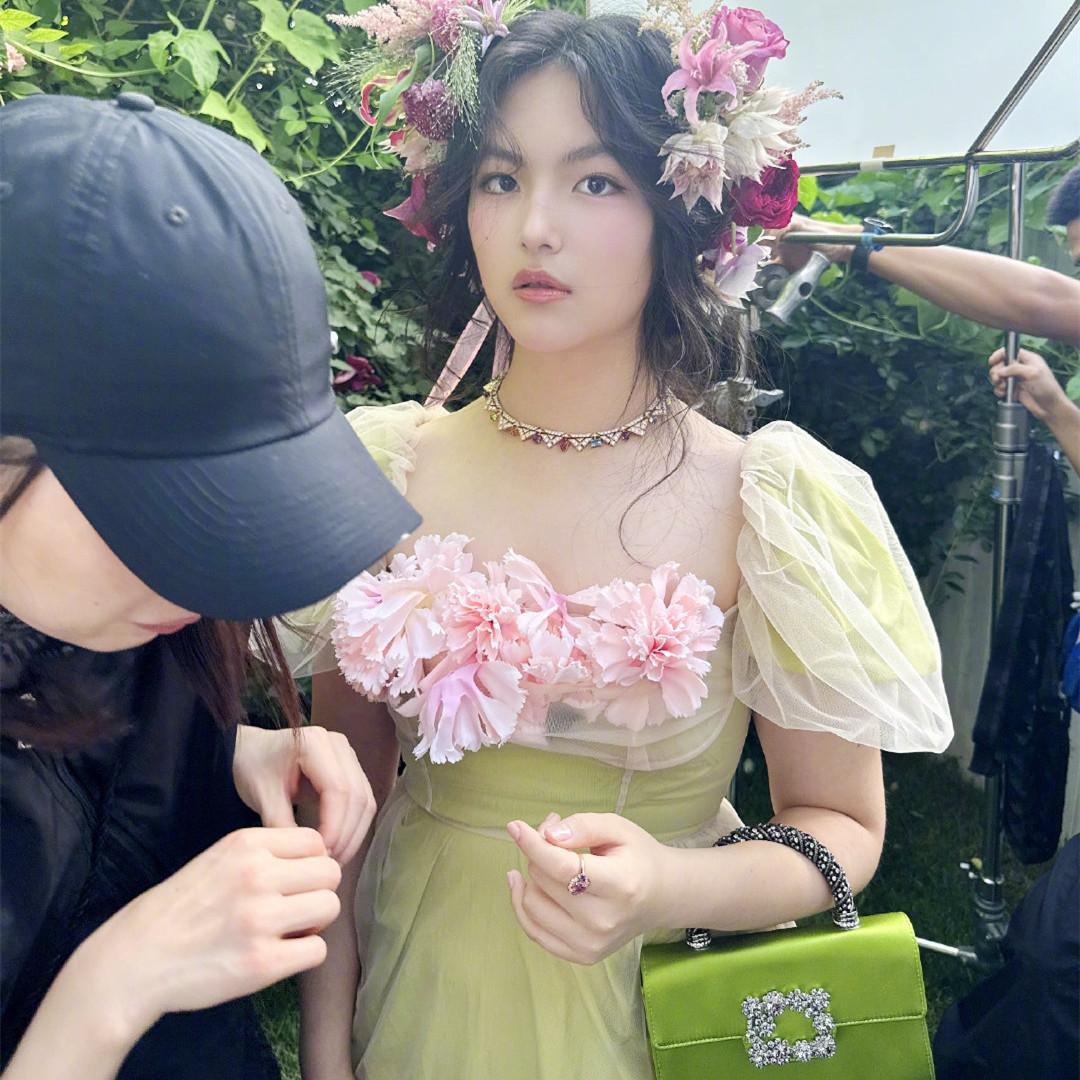 品牌價值在她的造型中從不以堆砌的方式呈現,而是融入創意表達。比如那條引發熱議的粉色抹胸紗裙,雖未刻意顯露 logo,但裙襬的玫瑰刺繡工藝與面料的細膩質感,都指向高端定製水準。