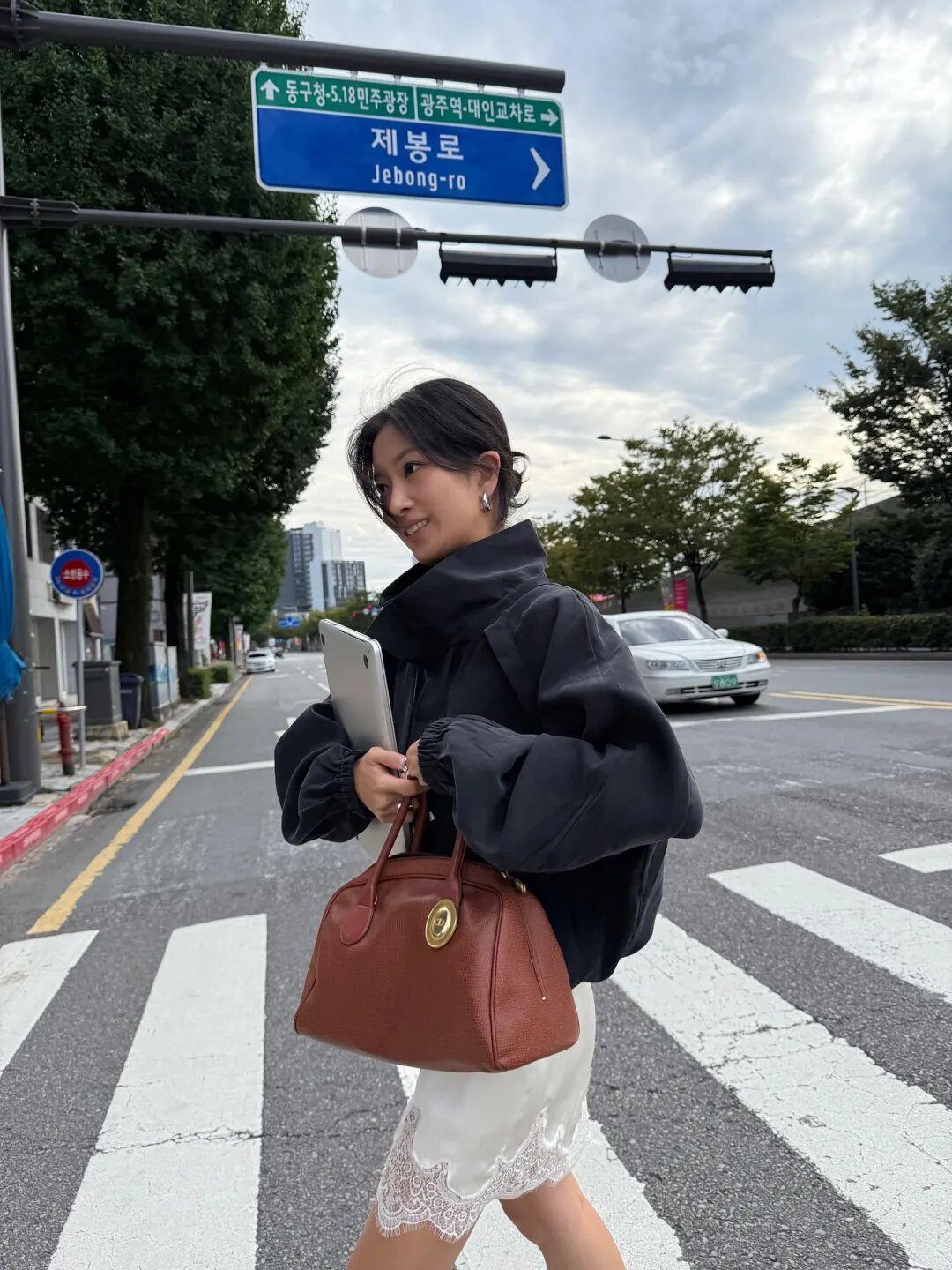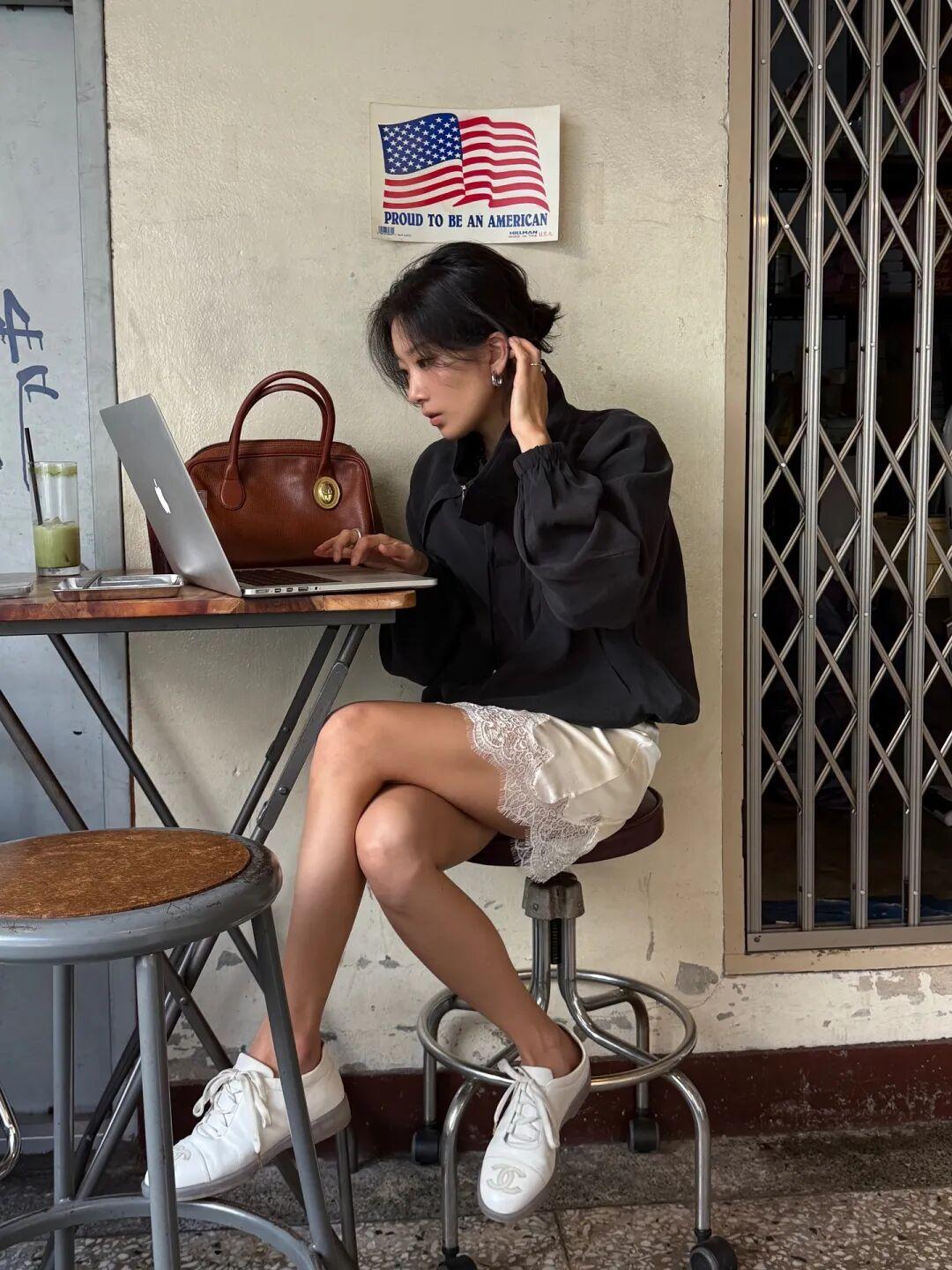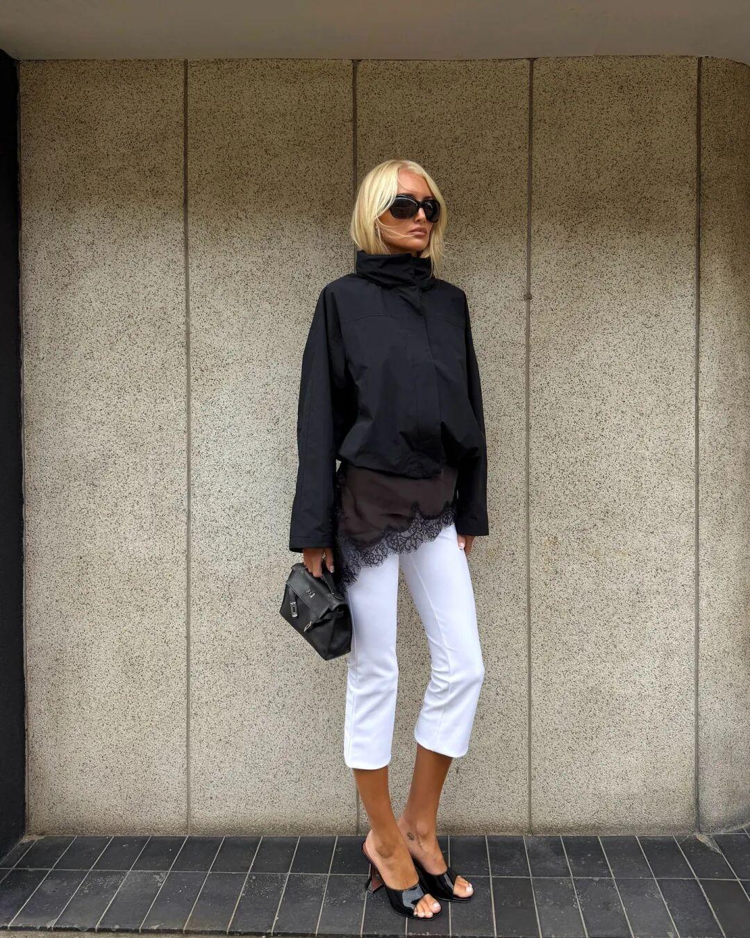 我還發現博主們還很喜歡在漏斗領夾克穿蕾絲上衣,露出一小截蕾絲下襬,搭七分褲穿,很有創意的穿法,但不太建議普通人嘗試,視覺上容易分成四小截