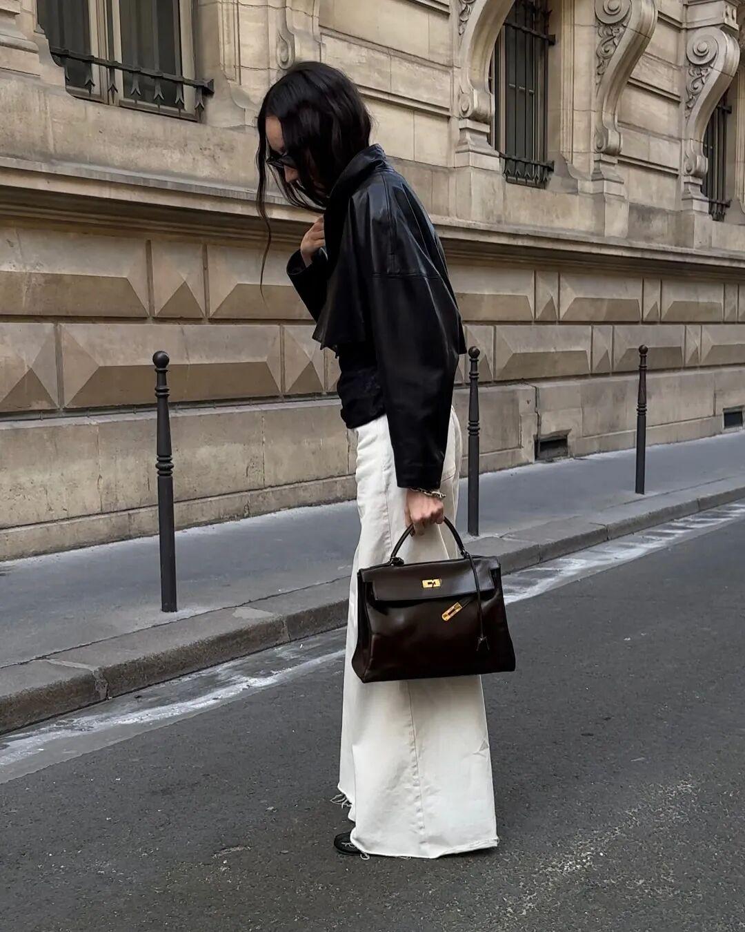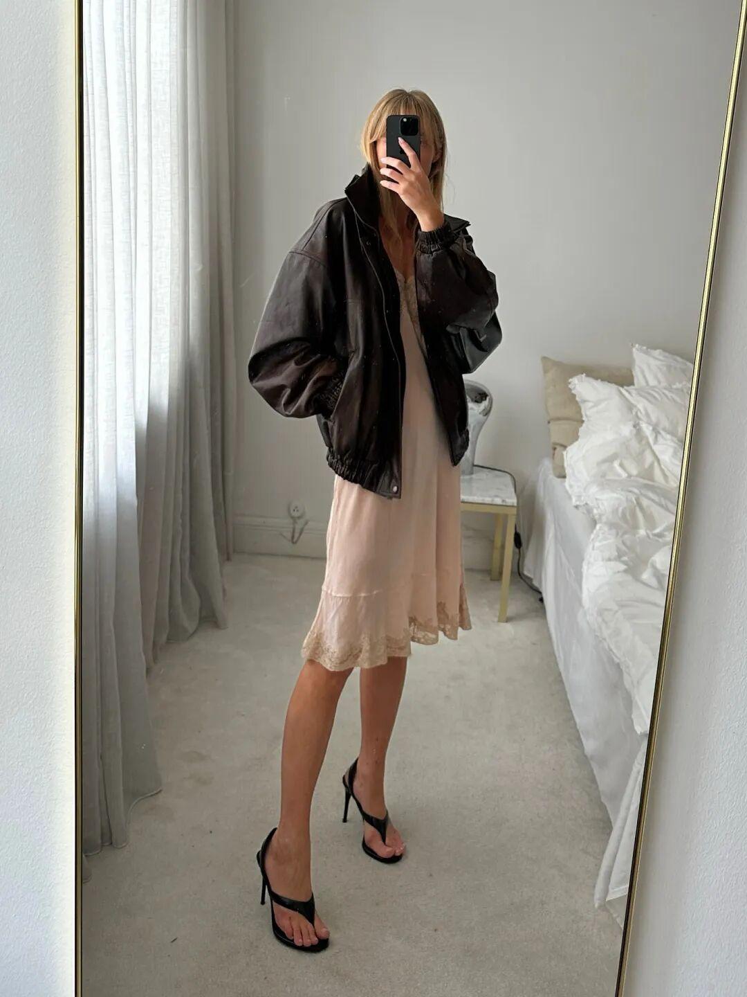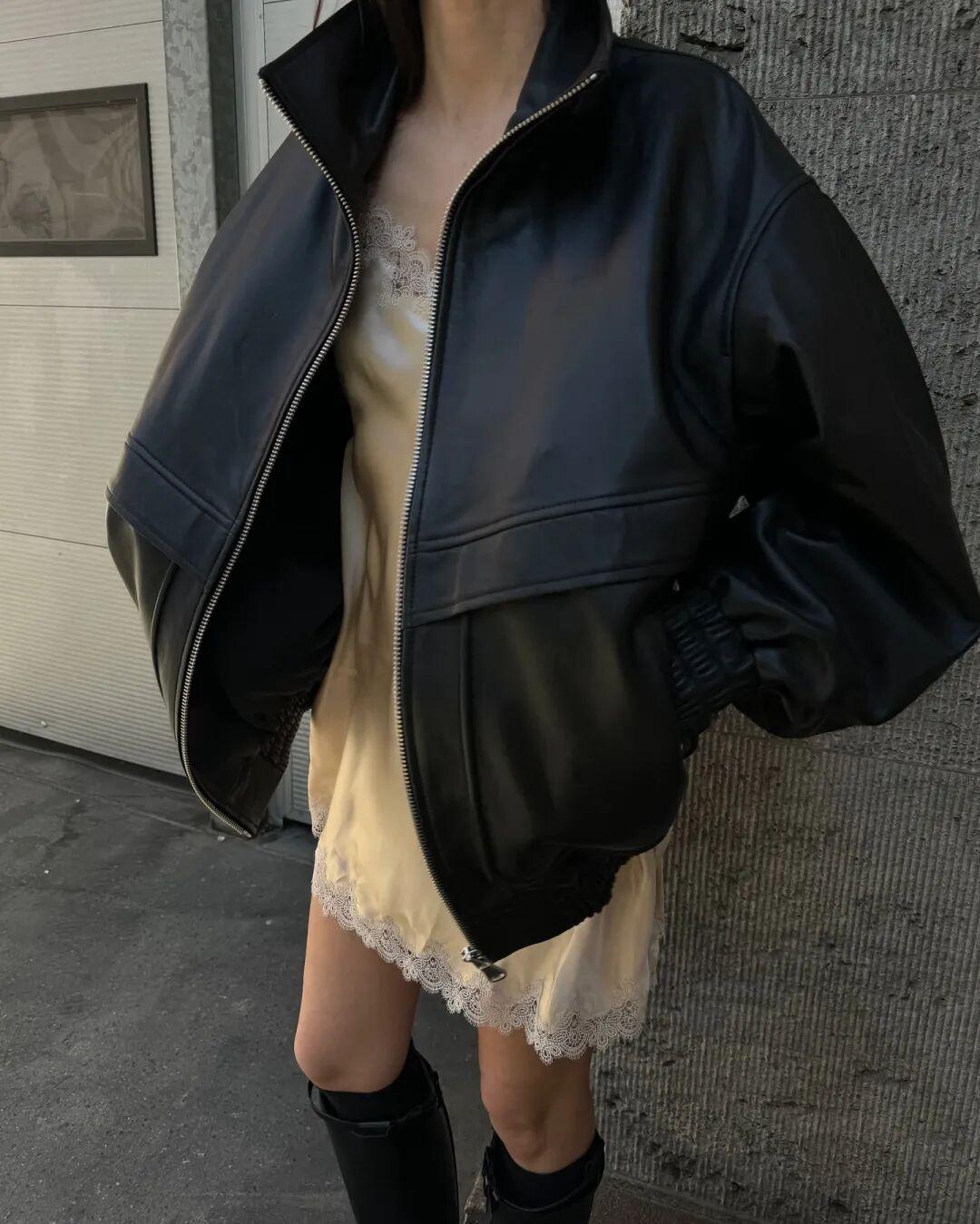 博主Beatrice Gutu最近很愛穿這件飛行員夾克,來自巴黎品牌Nour Hammour,皮衣是他家的拳頭產品。▼