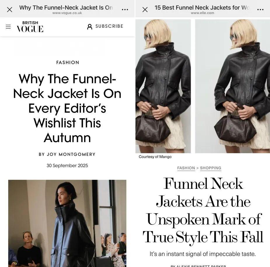 Vogue、Elle等時尚網站前後陸續都寫了這件漏斗領外套。▼