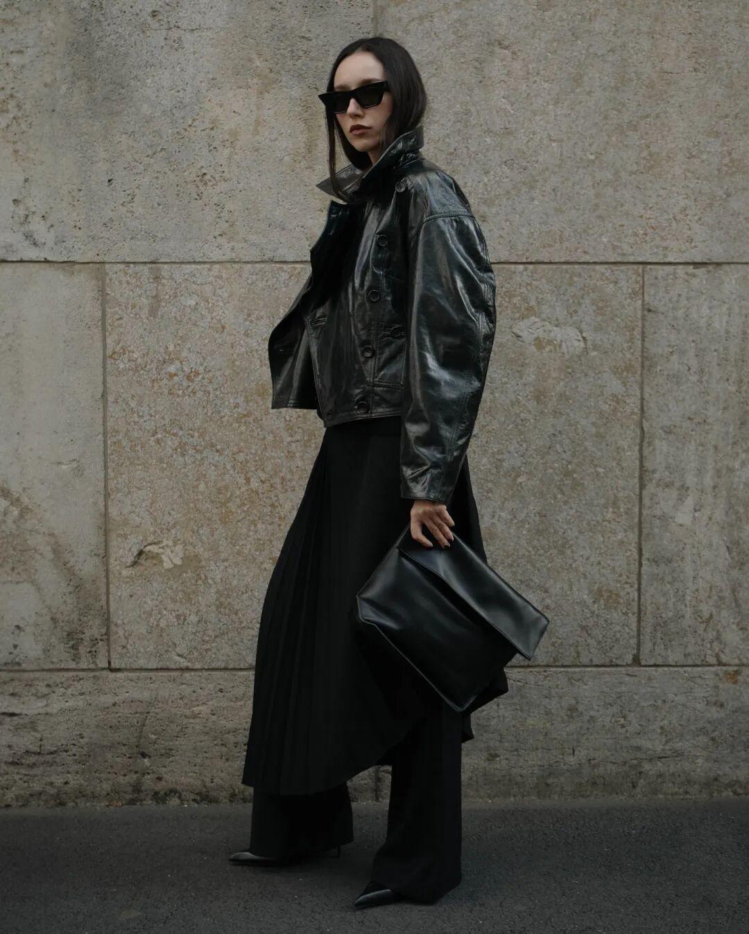 漏斗領會犧牲一點露膚度,可以選短款的皮衣,長度建議在臀上或者剛好過臀,更顯利落。▼