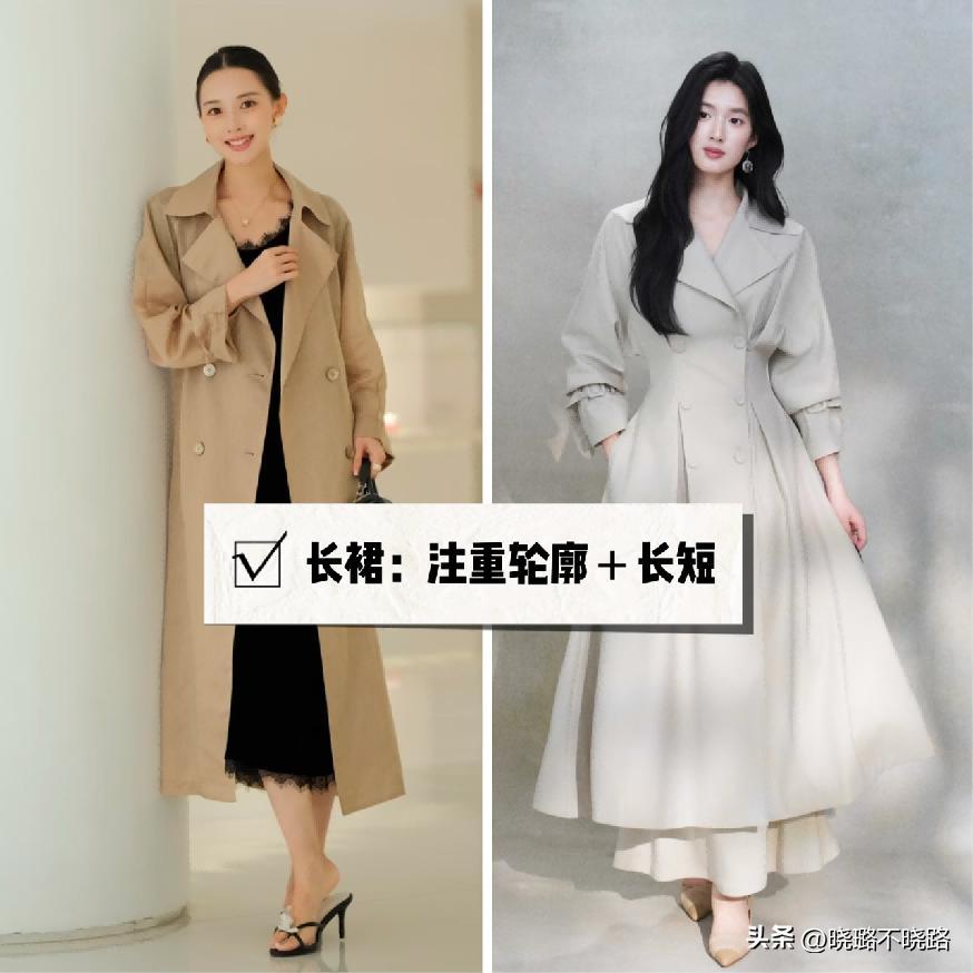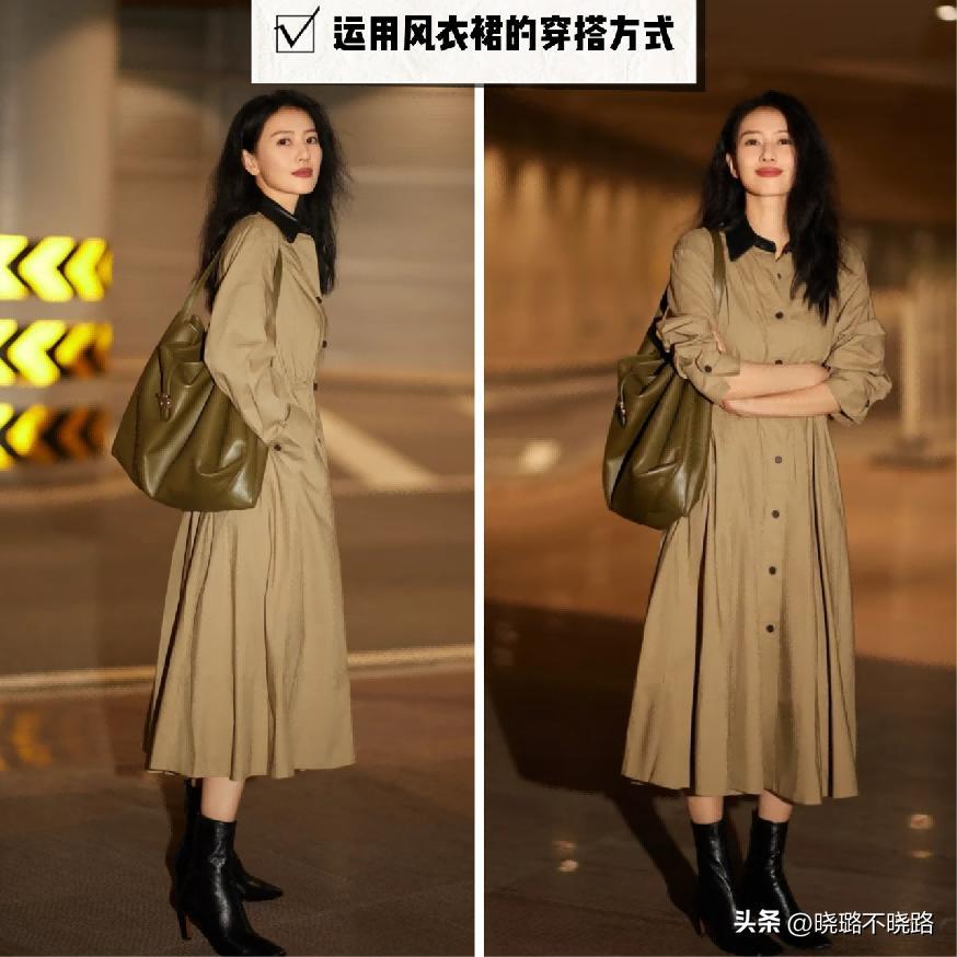 在當下的季節還沒有過於寒冷的時候,其實推薦各位女性可以學一學時尚博主以及女藝人們運用風衣裙的穿搭方式,單獨搭配風衣單品,其版型的狀態以及色系一定要更加的穩定和優質一些,也注重自帶高腰修飾效果,體現高腰水平線的位置。