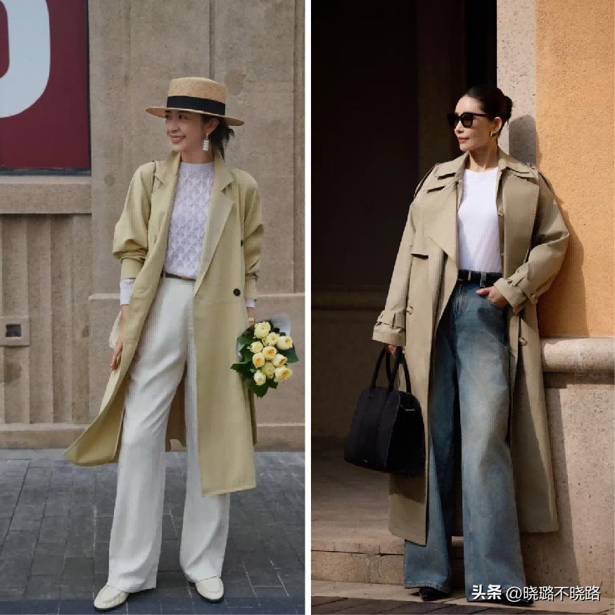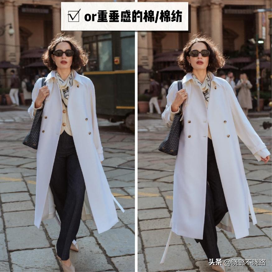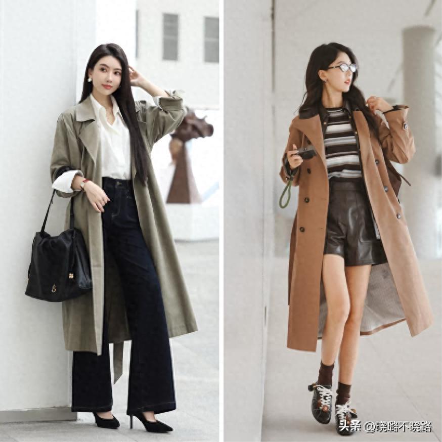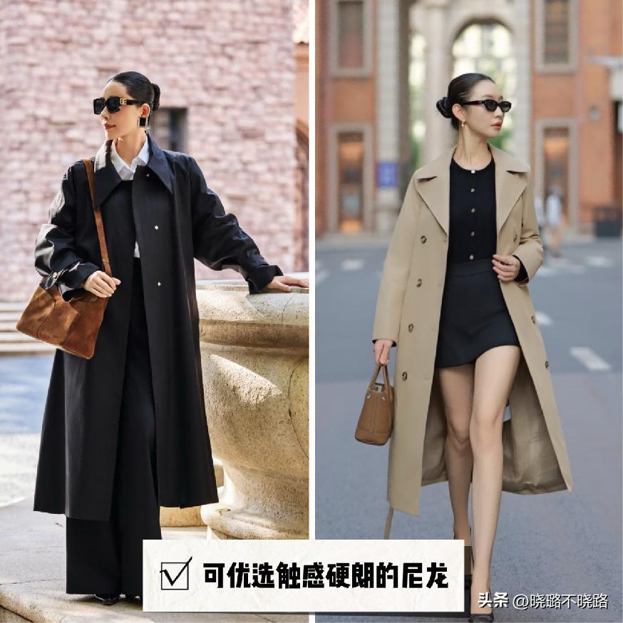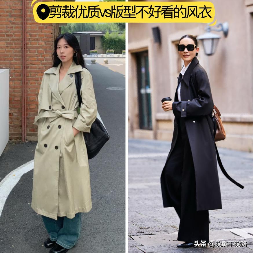 風衣是一款偏向於長款的外套款式,所以在搭配起來的時候,其實你要運用什麼樣的材質和麪料就是比較關鍵的,在這一組對比圖當中,大家就可以明顯的看出來,如果面料不好或者是材質用的比較廉價,那麼體現出來的視覺質感是完全沒有任何優勢的。反觀面料比較好、比較優質的類型的風衣,展現出來的視覺質感以及氣質狀態,還有就是對身形的修飾都比較友好。