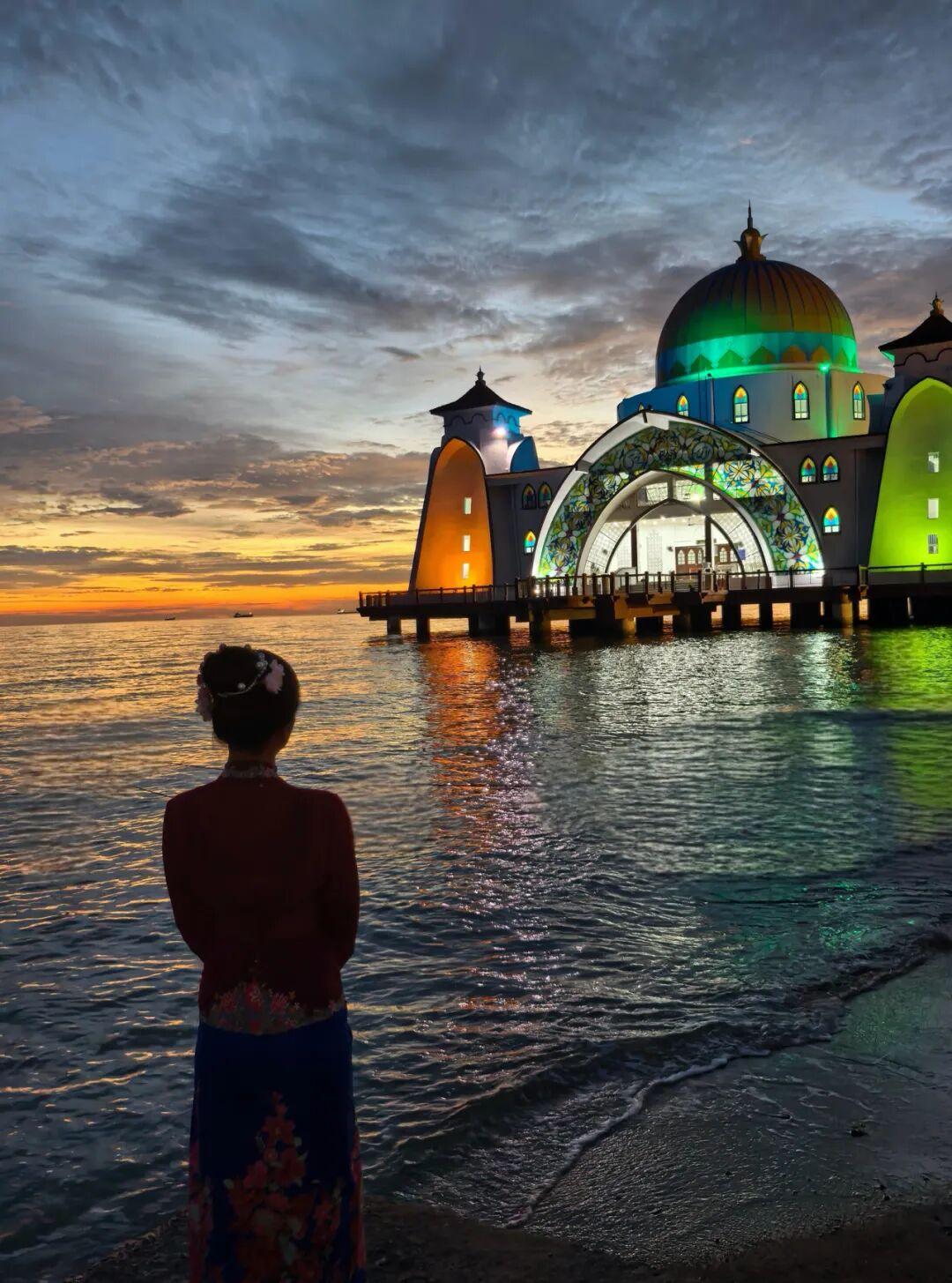 娥娜丹青:馬六甲海上清真寺,絕美黃昏與虔誠祈禱的吟唱。▼