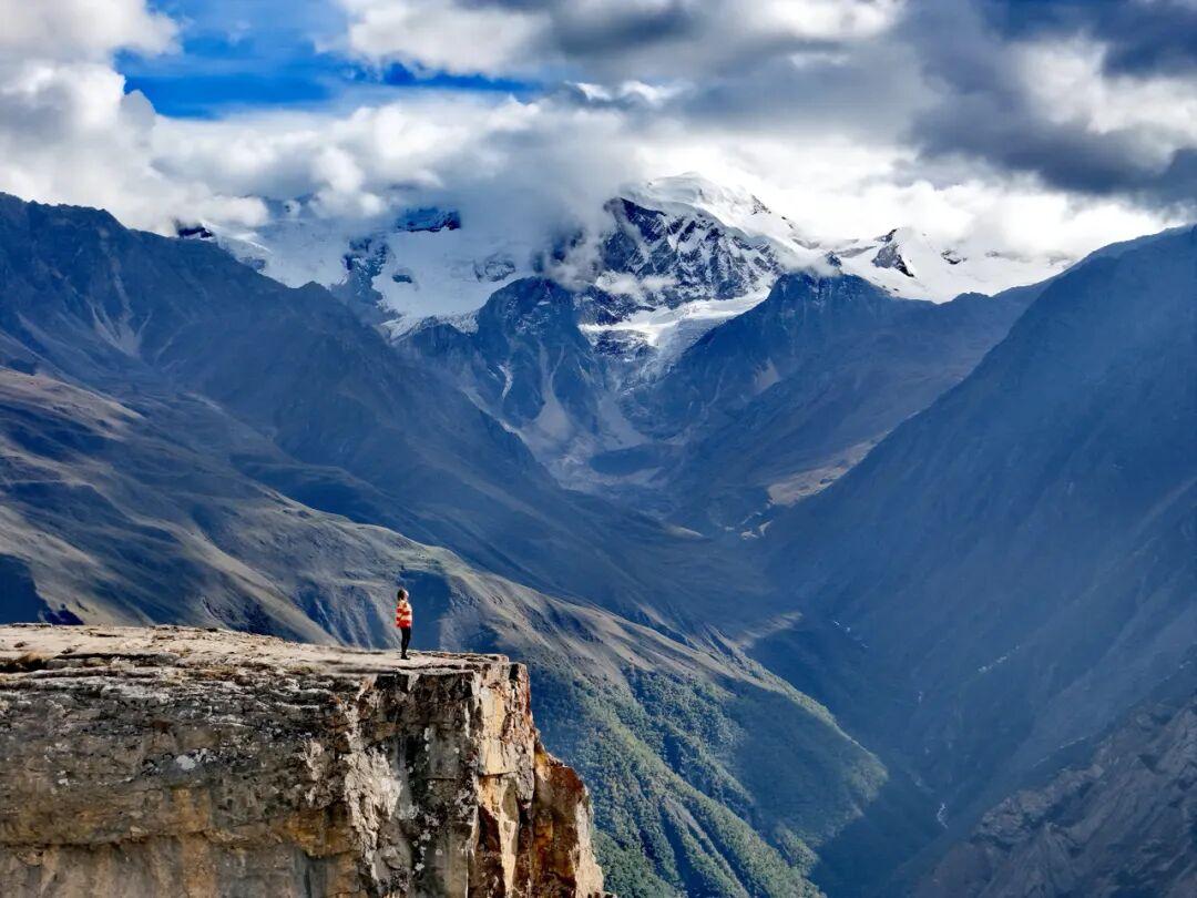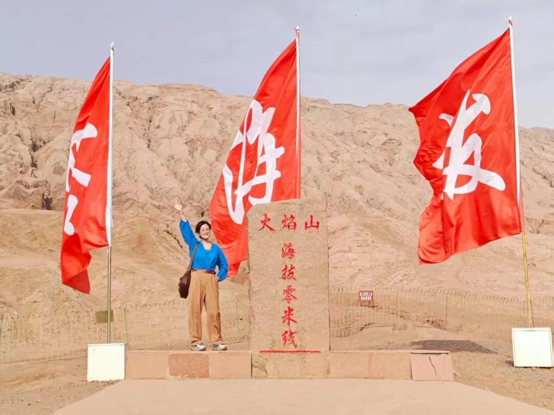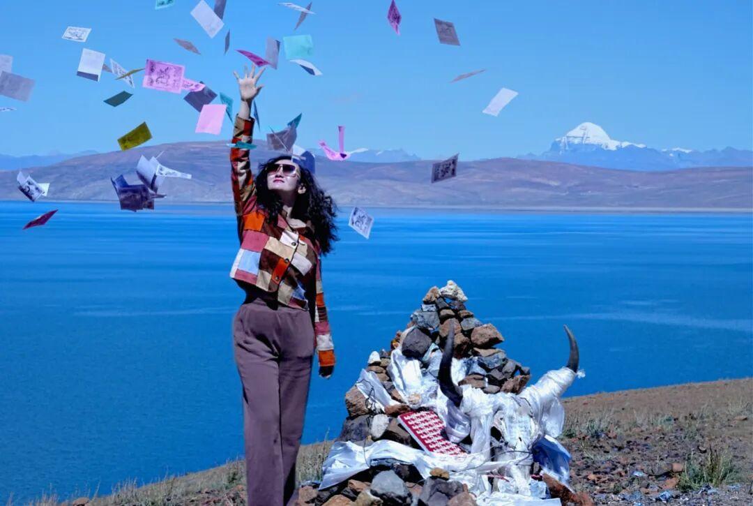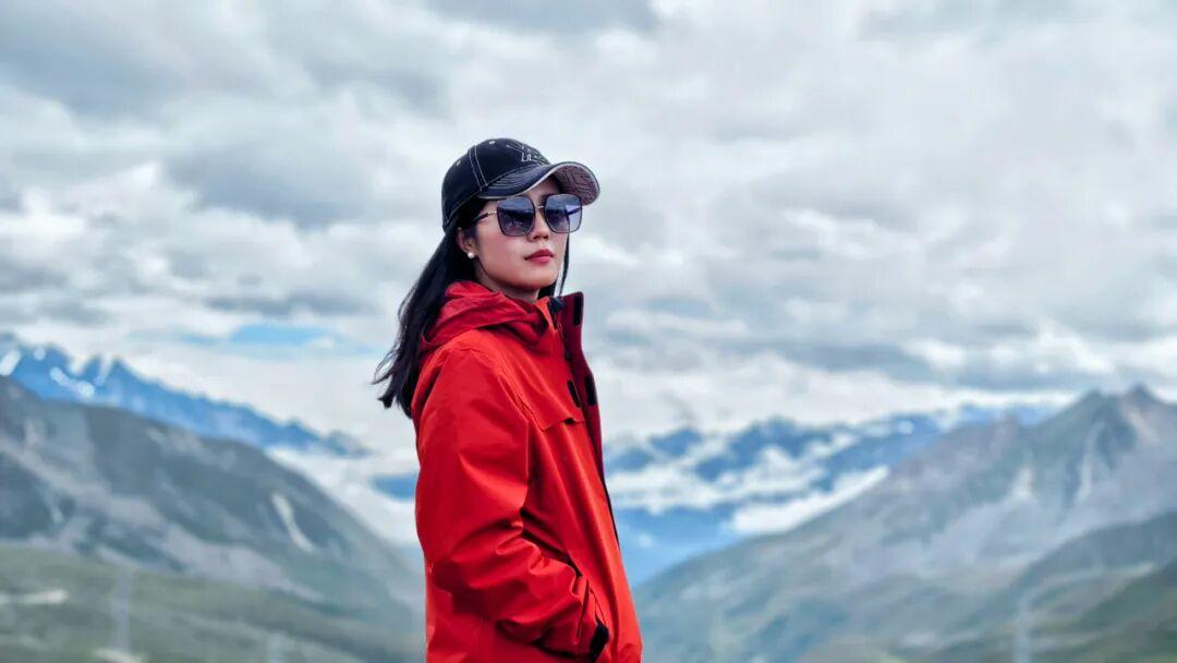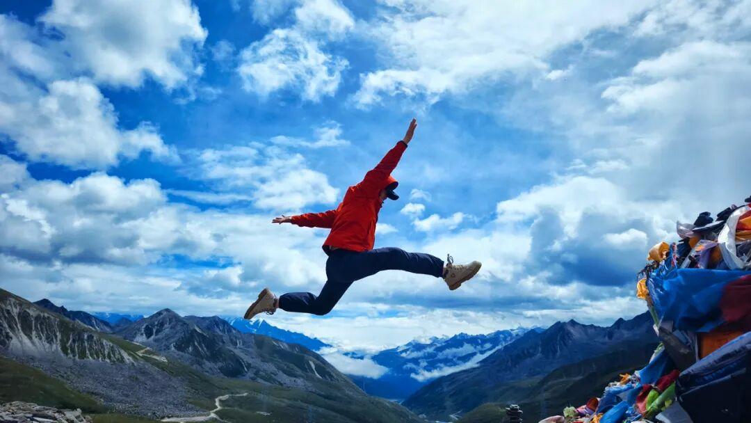 心上梔子:四川甘孜州折多山(康巴第一關)318國道旁的壯美景緻。身着紅衣,在4348米高海拔處停留、跳躍、眺望,雪山、經幡爲背景,盡顯自由與自然之美。▼