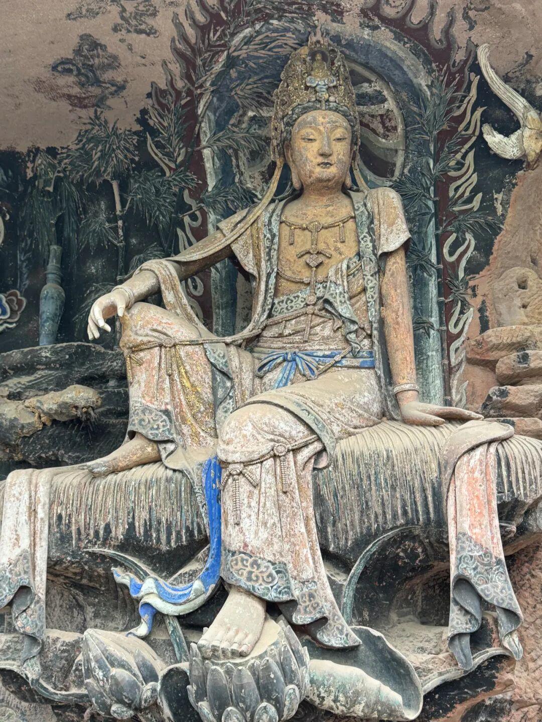 Soar:中秋來到安嶽毗盧洞北宋紫竹觀音,本名水月觀音,因石刻前方有個小水池,十五的月亮必會投射其中反射月光到觀音身上形成光暈。可惜歷史上被填平且左手被破壞後復修,遠沒有右手珠圓玉潤,故被稱爲“東方維納斯”。▼