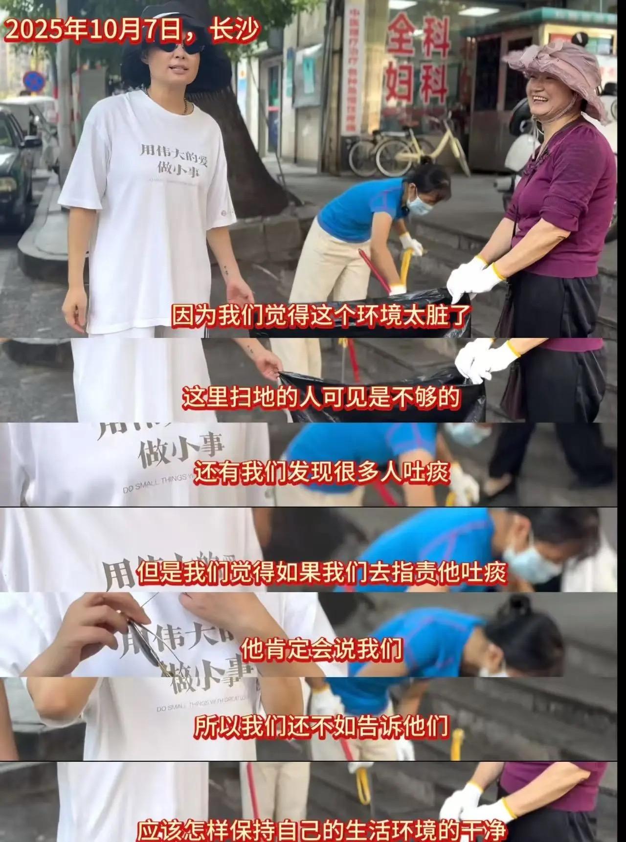 比如愛護我們身邊的環境,隨手打掃街道的衛生。就像袁立帶着幾名工作人員、在清理大街一樣的。