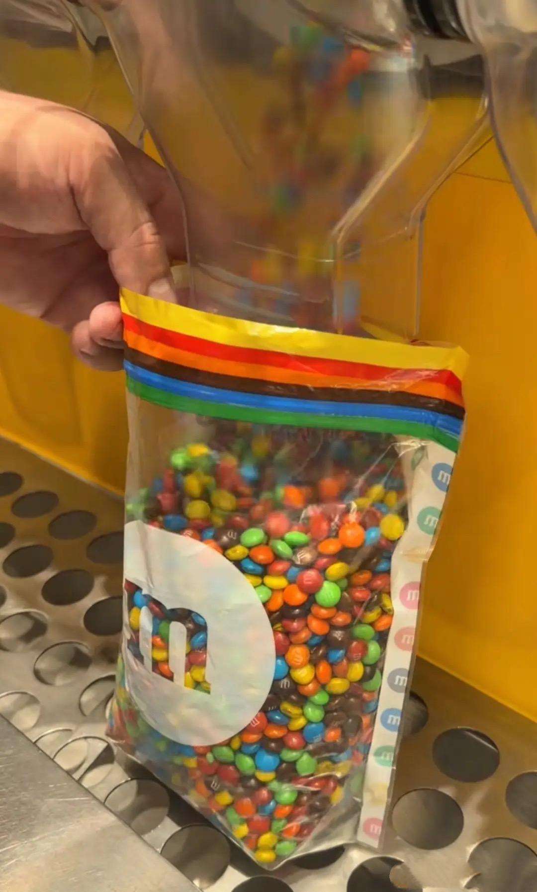下面嘩啦嘩啦就會出來很多巧克力豆,量夠了以後就把下面的開關關上。這種售賣方式也挺特別的,而且比較乾淨衛生,都不可以直接接觸到。