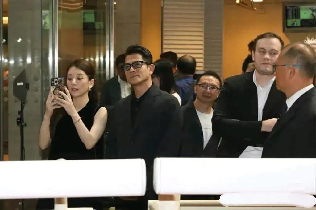 郭富城心情很好,站在方媛身邊、臉上時刻都帶着笑意。大概是要生三胎了、心裏喜不自勝吧,方媛拿着手機拍照,他就安靜的陪着。