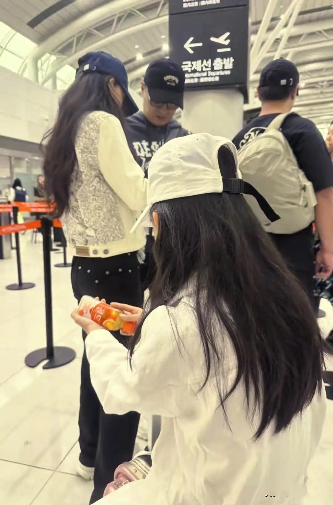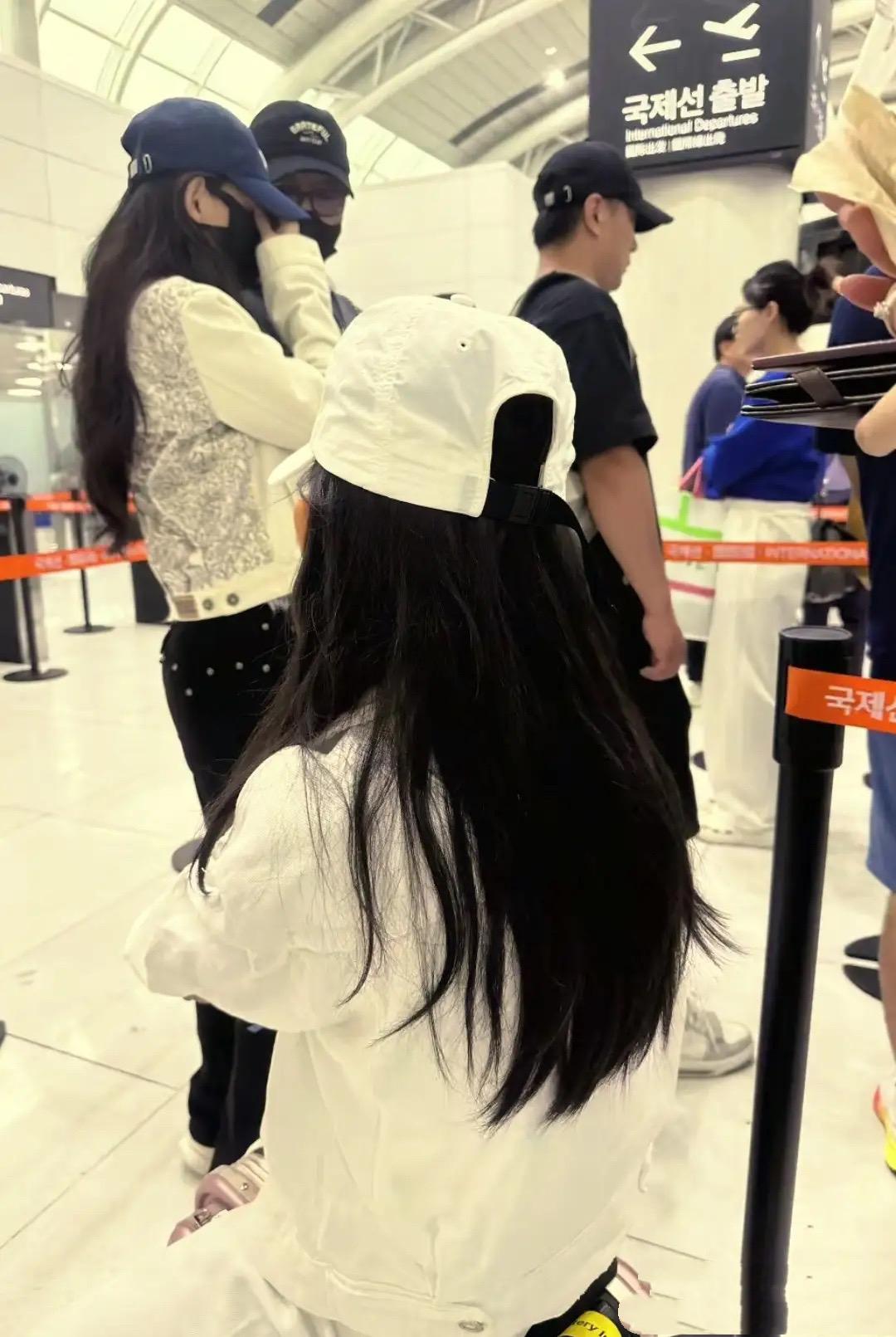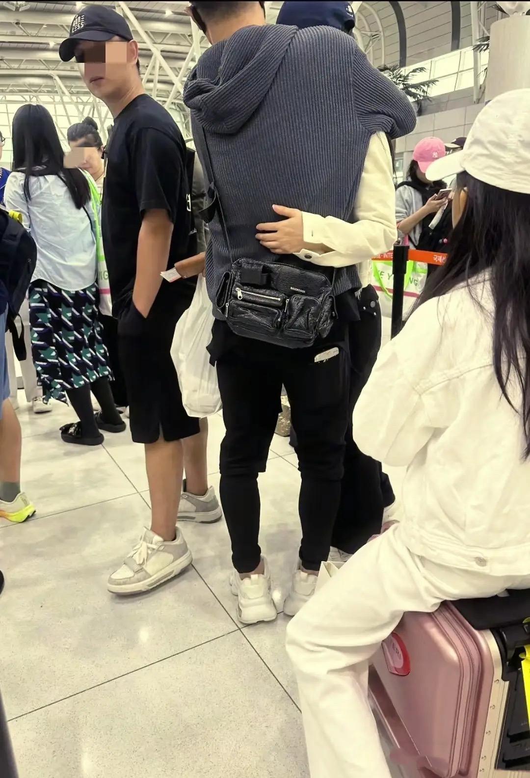 兩個人戴着同款棒球帽、還有黑色口罩,臉對臉親密的談話。他們應該是坐返程的飛機,只是重點並不一樣。