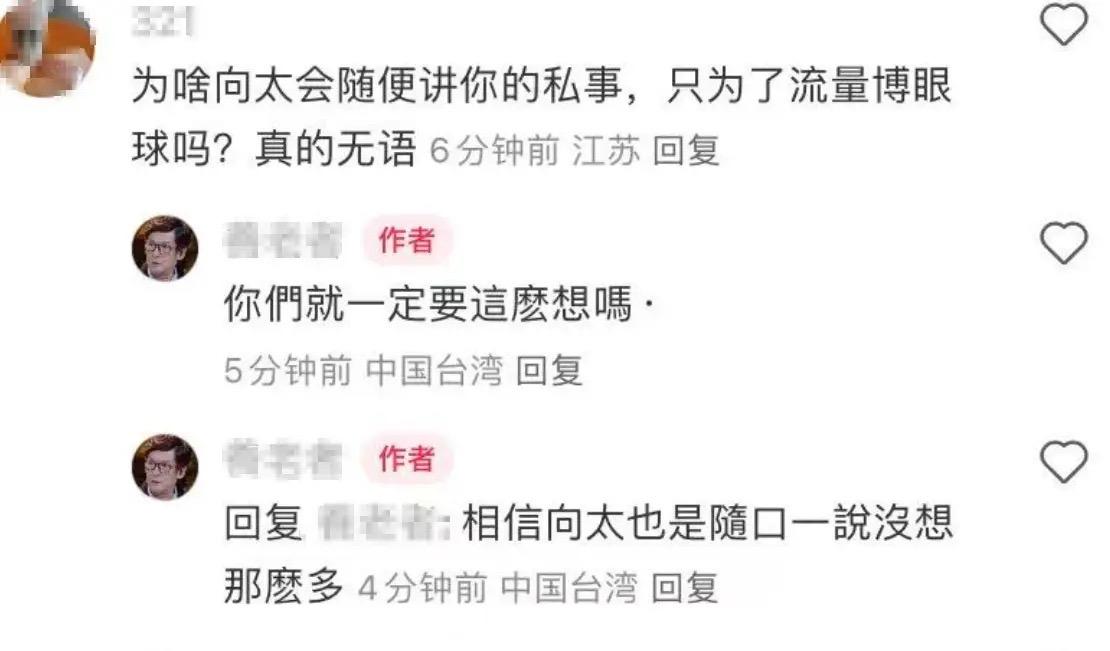 有網友認爲向太並不無辜,隨便講郭爸爸的私事、只是爲了博流量眼球。可郭爸爸反而回復“你們就一定要這麼想嗎?”、“向太也是隨口一說,沒想那麼多”。