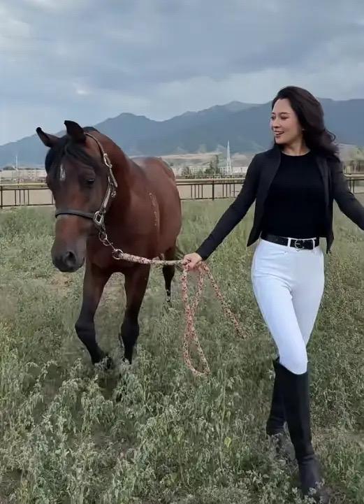 森林本真是很溫和大氣,鏡頭裏她牽着馬、行走在草地上,畫面又美又颯。森林北穿着緊身短上衣,白色緊身褲、還有馬靴,很颯。