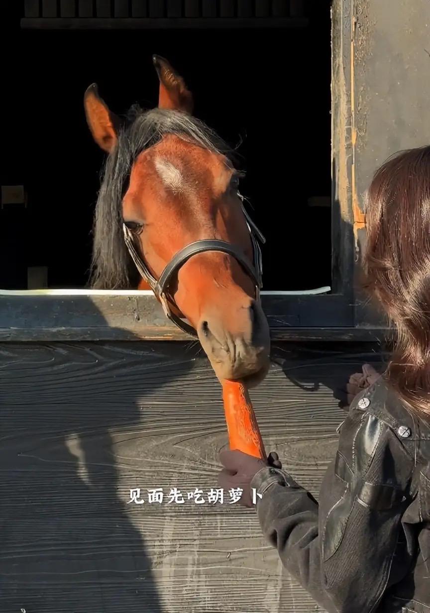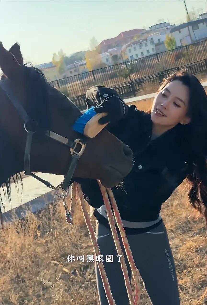 她在新疆養了一匹馬,還在網友的幫助下給它取了一個名字叫黑眼圈。大概是這匹馬的眼圈總是黑黑的,網友就提議給它叫黑眼圈了。