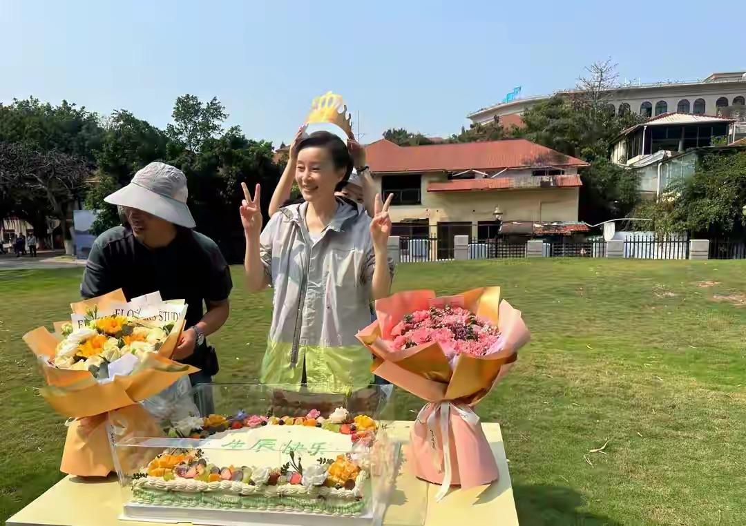 在寬敞的綠草坪上,吳越素顏出鏡、雙手比耶,她開心的像個孩子、滿臉都是書卷氣。長方形的大蛋糕、還有兩束鮮花,儀式感滿滿!
