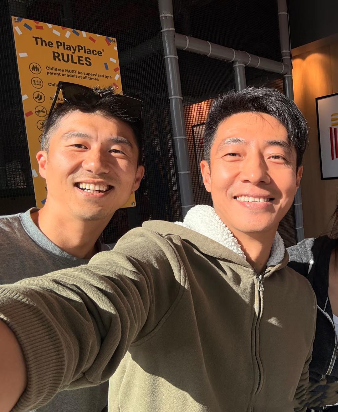 49歲撒貝寧陪老婆回孃家,穿羽絨馬甲凍得把手插兜,合影還舉相機