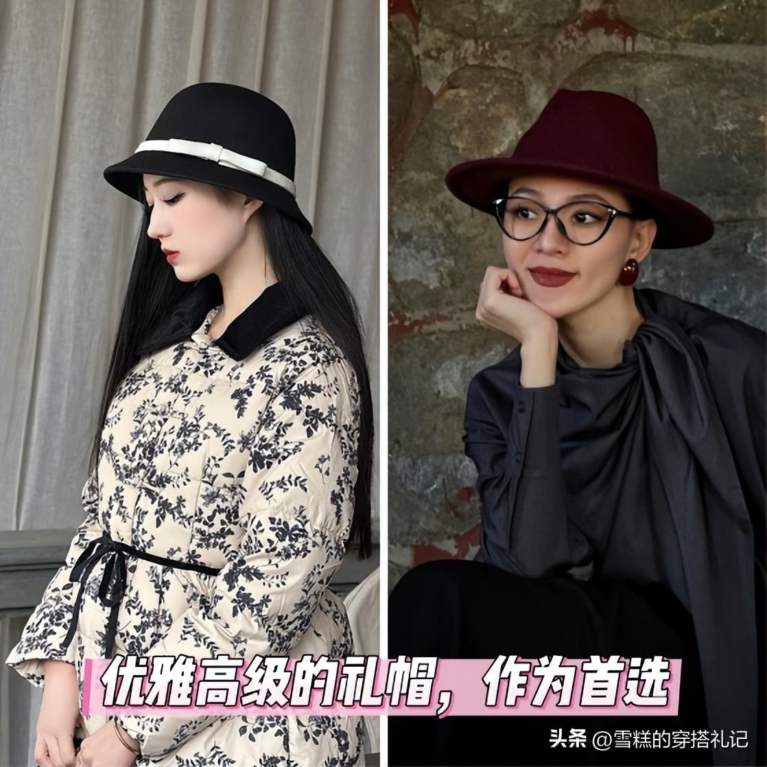 第1款要推薦給大家進行運用的,就是能夠體現出來優雅又高級的氣質狀態的帽型↣禮帽!這一款帽子的版型狀態,它本身所襯托出來的優雅感真的是非常明顯,而且對於每一個年齡階段的女性來說都可以放心的進行運用,運用於一些比較正式的場合當中,和一些自帶優雅和溫柔高級性能的單品在整體視覺上的契合度會比較高一些。