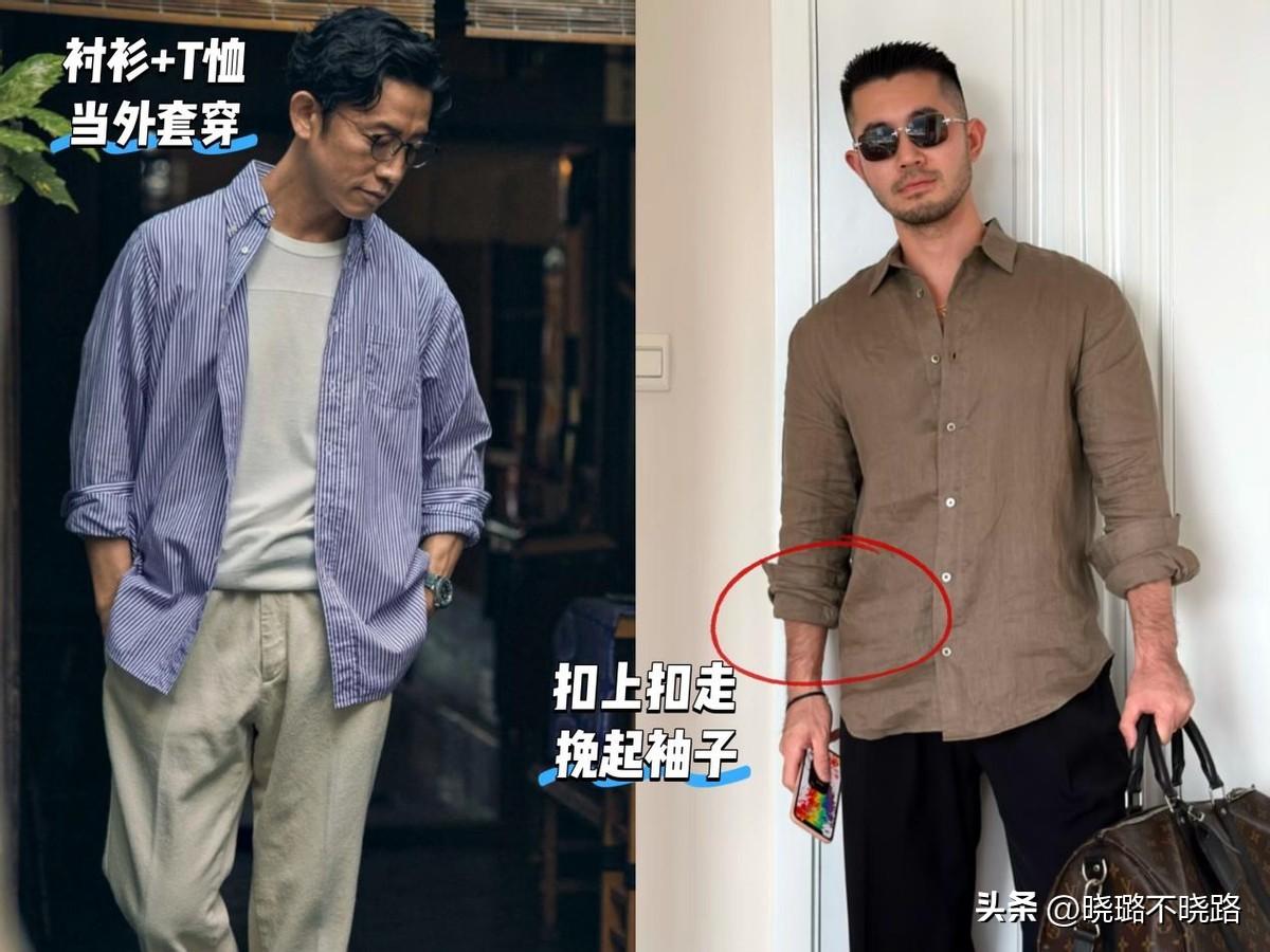 其實關於男性襯衫的最佳穿法還是這兩種,第一就是把襯衫當外套搭配休閒白T,這套穿搭不管幾歲都適用;第二就是把袖子玩起來穿,爲什麼我們說全塞襯衫顯得很油膩,就是因爲不緊繃了,不夠放鬆,挽起袖子這個簡簡單單的小細節就能讓你整個人看起來放鬆又時髦。