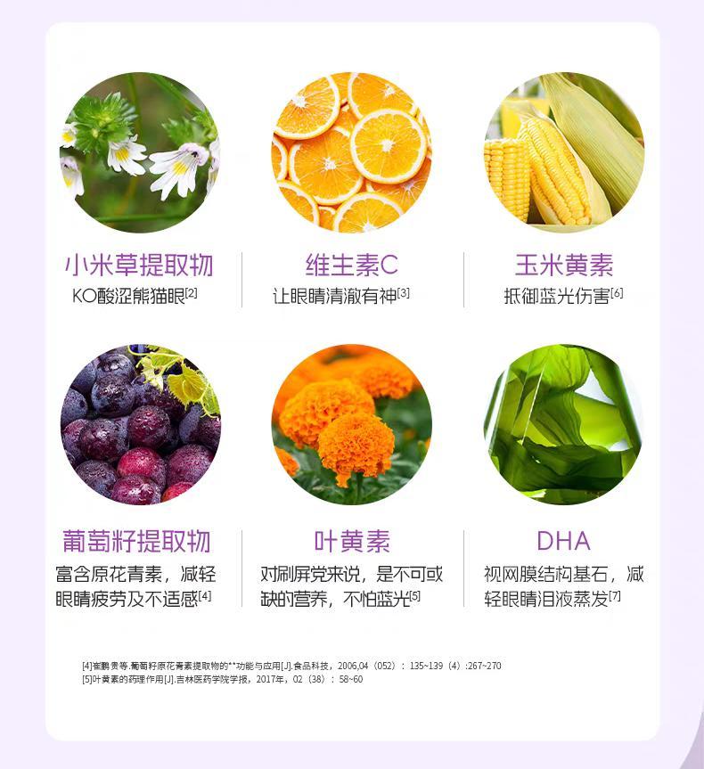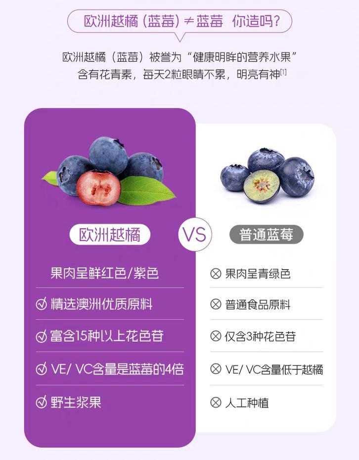 對於藍莓原料的挑選也很嚴苛,歐洲越橘富含15種+花色苷,VC/VE的含量也是普通藍莓的4倍,護眼效果更好。▼